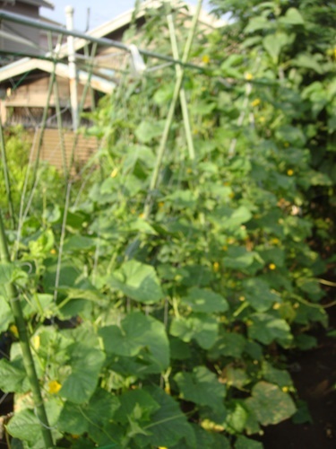 我が家の横の農園のキュウリも収穫の最盛期を迎えています。今年は10本ほど苗を購入しゴールデンウィークの後に定植しましたがうどんこ病にもあまりかからずに順調に成長しました。採り頃、食べ頃のキュウリが至る所に。栽培者に似て!!キュウリも真っ直ぐに。スーパーにも出せそうな出来栄え。まだまだ多くの花をつけています。もちろん食べきれません、そして数日後のは私と同じメタボな姿に。よって、一生懸命会社の同僚にも運んでいるのですが。
