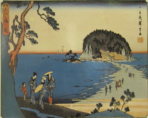 祭りの帰りに江ノ島地下道を利用。地下道の壁には江ノ島を描いた各種の浮世絵が展示されていた。「相州江ノ島」 歌川広重作干潮時、江ノ島へ渡る人々の姿が描かれているのです。「諸国名所百景」 「相州七里ヶ浜」 歌川広重作こちらの浮世絵には、七里ヶ浜から見た江ノ島と富士山が描かれていた。 「相州江ノ嶋岩屋之図 」 歌川広重作江ノ島の南の海岸にある、岩の洞窟の「岩屋」の入口の画 「冨嶽三十六景」「相州江ノ島」。こちらは葛飾北斎の作品。片瀬浜から見た春の江ノ島。萌え出る若葉と江ノ島弁天にいたる参道、両岸の茶店や家並みが細かく描かれています。潮が引いて、江ノ島へ向かう人々の様子そして江ノ島弁天の三重塔の姿も。昔の江ノ島の姿を各種浮世絵で楽しむことが出来たのです。