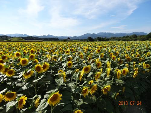 宮崎・国富町の現場に出張の折、大きなひまわり畑の横をレンタカーで通過。 皆同じ方向を向いていますが太陽の方向とは違う方向に。 西洋ミツバチが訪花していました。 ミツバチはひまわりの花粉が大好きなのです。 花が太陽の動きにつれてまわることから「日まわり(向日葵)」。しかし実際には、「花首の柔らかい、つぼみのときだけ昼間、太陽の方向を向いて夜に向きを戻し、成長して花が咲いてからは東を向く」、というのが本当のようなのです。 巨大なひまわり畑。 また1台の車が停車し、立派な一眼レフカメラを持つ紳士がひまわり畑を撮影。 オランダ人画家ゴッホが好んで描いた花の一つなのです。