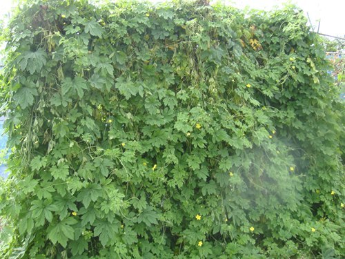 我が農園の下の義兄の畑のゴーヤが元気に育っています。緑のカーテン状態。可憐な黄色い花。黄色の5弁。 日に日に大きくなっていくゴーヤの実。 和名の「ツルレイシ」は、イボに覆われた果実の外観と、完熟すると仮種皮が甘くなるという2つの形質が、ムクロジ科の果樹であるレイシ(ライチ)に似ていることに由来すると。