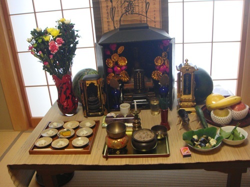 妻と我が実家の盆参りに行ってきました、とは言え我が実家は我が家から徒歩3分。部屋には真菰を敷いた祭壇が設置されていました。十三日の夜、玄関や軒下に提灯をつるして、門の近くでオガラを燃やして迎え火をたき先祖を迎えたのです。私が子供の頃は、祭壇の前の両側に葉のついた青竹を立て、竹の上部にしめ縄が張ってありました。そしてそのしめ縄に稲やほおずき、昆布等が吊されていましたが最近ではこれが省略されていました。 盆棚にはナスときゅうりにオガラをさした牛馬が 飾られていました。精霊があの世から帰ってくる時、この世から帰っていく時の乗り物とされているのです。また、きゅうりの馬はご先祖様の霊が一刻も早く家に帰って来てもらうための早い乗り物で、ナスの牛は帰る時にゆっくり帰ってもらうための遅い乗り物の意味と言われているのです。そして里芋の葉の上にはナスをサイコロ状に刻んだ『水の子』 も。キュウリや洗米を以前は入れていた記憶もありますが・・・・・・。これは牛馬の餌であると聞かせれていましたが、たくさんのご先祖さまをお迎えするので、皆さんに行き渡るように、こうしたたくさんのお米や野菜の粒をお供えするのだとの説もあるようです。兄姉夫婦が一同に揃った直後に檀家の住職が経をあげに来てくれたのです。そして今日は息子と共に妻の実家への盆参り。