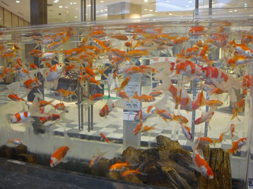 下水道展を訪ねてくださったお客様と三越日本橋店10階・なだ万へ食事に行ってきました。入り国には金魚のアクアリウムアートなるものを展示していました。 『フォールアクアリウム』、水槽の片面が滝のように水が流れ落ちていて、その流れる水越しに水槽の中にいる金魚を眺める、というアート。アートアクエリアムプロデューサー 木村英智氏の作品。新館玄関にあり、長さ4-5メートルはある水槽に赤と白の和金が豪快に泳いでいました。 涼しげな金魚 金魚 金魚 ・・・・・。暑い夏に涼しげな雰囲気をかもしだしてくれていたのです。しかしやはりビールが恋しくて、鑑賞後は足早に10Fに向かったのでした。 エレベーター横にウインドウケース。 このには「未来へのかけ橋」として、イルカの大群が乱舞!
