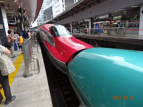 土日を利用し、大曲花火大会を上司、同僚と楽しんできました。大曲のお客様が、我々が未だ見たことがないとの事で、枡席を準備し招待してくれたのでした。東京駅で新幹線で大曲へ向かいました。新幹線スーパーこまち7号+はやぶさ7号連結部。秋田新幹線E6系は、東北新幹線E5系と併結運転を行い、新幹線区間を国内最高速320km/hで走行するため、多くの最先端技術を採用した新在直通車両。E5系と同様、ロングノーズタイプの先頭形状が特徴で、車体上部に施された茜色(濃い赤)の塗装が鮮やか。この車両に乗車するのは初体験。3時間強で大曲駅に到着。茜色と車体デザインが自動車のフェラーリを連想させた。 エスカレータには多くの花火見物客が。そして丸子川河畔特設会場に到着。地元の民謡も披露されていた。花火大会のポスターが至る所に貼られていた。 雄物川河川敷に見物桟敷席に向かう。ビール、食料類を買い込みカートにて運ぶ。 道の両側には多くの屋台が。漸く河川敷入り口に到着。会場図案内。 私のチケット。 会場内は既にごった返し。 途中巨大な段ボール箱で出来たゴミ箱もいたる場所に設置されていた。 漸く座席までたどり着く。ベニヤ板が見事に敷かれ、6人席用に区画されていた。座席設置に2億円かかったと。待つこと1.5時間。漸く17:30になり『昼花火』がスタート。昼花火の競技は、全国でも大曲の花火だけと。昼花火は雅趣に富んだ見応えのある花火で、昔から花火通の粋人が好む花火。 煙竜(煙物)や割物で競技を行うのです。煙竜(煙物)は夜の光の代わりに色煙(紅・黄・青・緑・紫など)を駆使して色彩豊かに空に模様を描き出したのです。この花火のポイントは模様の多様化と色彩を鮮明に描き出すことにあるとのこと。この花火のポイントは、花火の形と鮮明な色彩。見事な色煙。