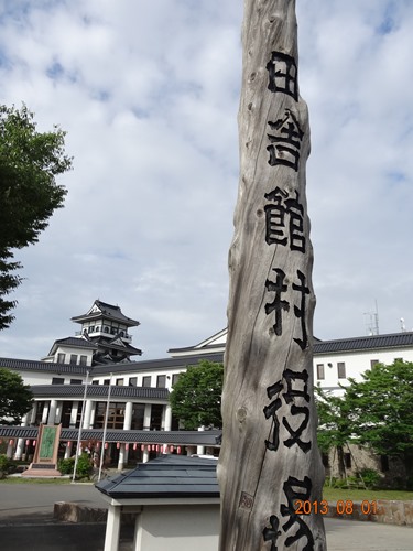 青森・田舎館村役場に仕事で行ってきました。まるで城のような村役場庁舎。天守閣も兼ね備えている立派な城、そして城内に入るにも大手門?らしきものまであり、本格的な城構えの実は村役場。 ピカピカの城、毎朝、村長は天守閣に上り、村の賑わいを眺めているのであろうか? 役場の中には今年の『巳』年と『絆』の巨大な毛筆の文字が。村の担当部長との打ち合わせを終え、この地の名物の『田んぼアート』を見るため天守閣・展望台入り口に向かう。大型観光バスでかけつけているツアーも。 展望台入り口。2ヶ所のセット券を300円で購入。説明案内書も配られていた。10月14日まで無休で見学可能とのこと。展望台からの視角を下に下絵を作製し植え付けを行ったと。 そして展望台へ。見事な田んぼアート。今年のテーマは「花魁とハリウッドスター」。1.5haと広大な水田に描いてる見事な芸術そして迫力。稲だけでこれほどの立体感を表現するとは驚きそのもの。左の花魁は梅沢富美男、右のハリウッドスターはマリリンモンローの「七年目の浮気」のワンシーンがモチーフになっているとのこと。巨大な花魁の姿。道路幅が約5mからこのアートの巨大さを想像してみてください。 顔も梅沢富美男の顔になんとなく・・・・。 そしてマリリンモンロー。彼女の表情や立体感を演出する陰影を表現した超力作。 顔の恍惚?の表情も見事、そして歯まで白く表現されていたのであった。 そして田んぼアートの反対側には岩木山の姿も。この日は残念ながら頂上は雲の隠れていたが。 下に降りて田んぼの前の道路を歩く。下からは何が描かれているか全く不明。 田んぼアートのテーマは毎年変わり、アートも表現方法が向上しているのです。1993年~2001年:岩木山2002年:つがるロマンの稲と月2003年:ダ・ヴィンチ「モナリザ」2004年:棟方志功「釈迦十六大弟子羅ご羅の柵」と「山神妃の柵」2005年:浮世絵・東洲斎写楽「二代大谷鬼次の奴江戸兵衛」と喜多川歌麿「歌撰恋之部・深く忍恋」2006年:俵屋宗達の「風神雷神図屏風」2007年:葛飾北斎の富嶽三十六景「神奈川沖浪裏」と「凱風快晴(赤富士)」2008年:恵比寿様と大黒様2009年:戦国武将とナポレオン2010年:弁慶と牛若丸2011年:竹取物語2012年:「悲母観音と不動明王」2013年:花魁とハリウッドスター「マリリン・モンロー」地上からのマリリンモンローの姿なのであるが・・・・。 今年2013年は7色9種類の稲を利用して描かれているとのこと。品種の異なる稲を何種類も植え、色を表現。緑は「つがるロマン」、白は「ゆきあそび」、赤は「べにあそび」と言う品種とのこと。まるで稲の葉に塗料を塗りつけているが如きに天然色が見事にそして不思議に出ているのであった。マリリンモンローの太腿の影やスカートのシワも表現している真に匠の技。 展望台の観光客は皆『すごい』を連発しているのであった。そしてもう一つの会場へ向かったのであった。