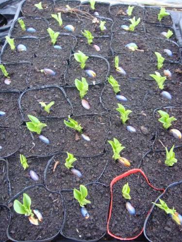 10月26日に種まきしたソラマメが2週間後には見事にほぼ完璧に発芽しました。 タネは畑に直接まくこともできますがタネが腐ることが多い事そして発芽時に野鳥が突く事があるのでビニールポットに播くことにしています。タネは黒い筋のある部分(「おはぐろ」といいます)を下にして土にさし込みます。タネの頭が見えるくらいの深さでよいのです。 そして本葉が3枚くらいの大きさになった頃に畑に植え付けるのです。この方法の方が直まきよりも確実なのです。 同様に同時に播いた「スナップエンドウ」も負けじと元気に発芽しています。 ことらも10cm程度に育ったら定植し防風、防霜用にネットを被せる予定なのです。