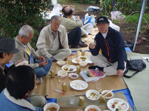 今年も11月の3連休の初日に我が農園で芋煮会をおこないました。参加者は我が高校3年の時のクラス仲間と我が同僚の総勢14名。日本の会社の現役社長達そして現役大学教授達も今年も参加してくれました。 我が農園の前の畦道にブルーシートそしてゴザを敷いた青空宴会場。晴天に恵まれるはずでしたが、途中ポツポツと雨の落ちる時間も。我が農園の里芋、ニンジン、ネギ等の新鮮野菜を大鍋で調理し芋煮の完成。 スーパーで高級肉?を調達し炭火焼き高級ステーキ。我が農園のニンニクも活躍。この青空農宴の料理品に偽装表示の言葉は無縁なのでした。 牡蠣のむき身を串焼きにして楽しむクラス仲間のMIKEさん。牡蠣の『MISSONI(味噌煮)』?? を意識してのこの日のこだわりのTシャツ?? 単身赴任の我が同僚の奥様も仙台から駆けつけてくださいました。楽天の応援で超多忙の中、今年も仙台名物『はらこ飯』を事前準備してくれたのでした。クラスのマドンナお二人、そして奥様なしでは成り立たないこの芋煮会?なのでした。 我が同僚も奥様に負けじとコックとして大活躍。秋刀魚と万願寺トウガラシの炭焼き担当。もう一人の同僚のNさんが準備してくれたハーフテントがこの日は大活躍。練炭コンロに炭を入れ、テントの中に持ち込み、その上の芋煮鍋を囲み宴は盛り上がったのでした。アルコールは某ビール会社に勤務するクラス仲間が差し入れしてくれたのです。今年は急用が出来参加されなかったのは残念でした。日本酒、焼酎、ウィスキーもほぼ飲みきってしまったのです。一昨年の悲惨な農宴?を反省し皆さん自己管理していたことは明白。 11時から16時近くまで大いに飲み、大いに食べ、大いに語り合ったのでした。そして記念撮影。 今年の忘年会は、ご自宅から相模湾越しに世界遺産の富士山の見えるYさん宅で行うことを決定し、この還暦過ぎのクラス仲間、そしてやや??若手同僚そして奥様との農宴をお開きとしたのでした。 そして昨日は早朝から『強者どもが夢の跡』 の片付けを我が農作業車で。既にカラスが好物のマヨネーズ(未開封)を朝食にとテーブル上に鎮座しマヨネーズを周囲に散乱させていたのでした。 ご参加いただいた皆様、お疲れ様でした。来年もやりましょう!!
