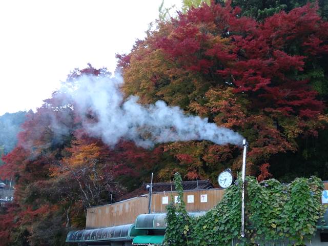 音戯の里へ到着。風の塔。ラウンジとミュージアムを結ぶ木造の塔で、この施設のシンボル。 徒歩で千頭駅に向かう。 折しも大井川鐵道のSLが到着。入場券を買い駅構内へ急ぐ。金谷駅から井川駅まで続く大井川鐡道は、全線全域お薦めの鉄道。ちなみに、鐵道の文字は" 金を失う "という字を敬遠し、「鉄」の字に「鐵」を採用していると。金谷駅⇔千頭駅においてSLが運行中で大人気なのである。 多くの観光客が下車してきた。 運転席内部では作業員が点検中。 この時の入線車両はC108。動輪の数がCは3個.Dは4個。 音戯の里の駐車場の紅葉も見事。 道の駅 巨大なオジサンの姿も。音戯の里のシンボル大、蛇口が地面から。 捻るといろんな音が出るのであった。青空の下、真っ赤に輝く紅葉。 362号線の山岳ドライブで山を越え天竜川沿いを下る。途中、昼食を。 和蕎麦と櫃まぶしを楽しんだのであった。 店主から店裏になっていたキウイフルーツをお土産にいのであった。