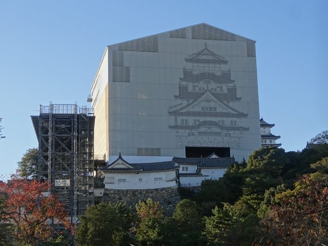 姫路城は、平成21年秋から平成26年度まで、大天守の保存修理工事中。 工事用の巨大な仮設が。1964年(昭和39年)に完了した解体復元工事から45年が過ぎ、漆喰壁(しっくいかべ)をはじめ上層部の軒(のき)やひさしに傷みや汚れが激しくなってきたため、本格的な修理を行っているのである。菱の門。櫓門と呼ばれる型式の二の丸の入口を固めた門で、両柱の上の冠木に木彫りの菱の紋のあることから、この名前が付いています。門全体に安土桃山時代の様式を残しており、城内で最も大きな門。 ぬの門。二重の門で下部には鉄板が貼られていた。 天守閣入り口へ。 平成23年3月に姫路城大天守修理見学施設「天空の白鷺」(てんくうのしらさぎ)がオープン。大天守が素屋根で覆われている間(平成23年度から約3年間)、内部に見学スペースを設け、修理の様子を公開。時期によっては漆喰壁の修理や屋根瓦のふき直しの様子など匠の技が間近に見られるのだ。エレベーターを利用して最上階へ向かう。 最上階から天守屋根を望む。 天守展望台からの景色。 西の丸長局(百間廊下)も見えた。 天守屋根の工事はほぼ終了か? 工事範囲外の姫路城西小天守。 水一門。「水の門」は、北の井戸から水を運ぶルートにあることから名付けられたとのこと。 ほの門。 狭間(さま)を覗く観光客の姿が。狭間は天守や櫓、塀などに開けられていて、長方形(ながしかく)のが矢狭間、円形、 三角形などは、鉄砲狭間、その数は今でも約千ほどと。この狭間によって描かれる 幾何学模様は、これもこの城の特色の一つで、よく写真や絵の材料にされているのです。 再び菱の門へ戻る。 折しも菊花展の真っ最中。 見事な色と種類の数々。 菊の盆栽も。