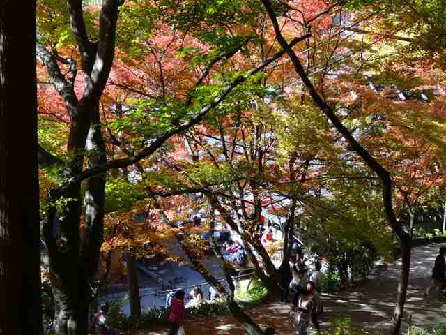 香嵐渓に戻る。入り口そして飯盛山上り口に建つ「香嵐渓」の石碑。 可愛い仏像の数々。 飯盛山の太子堂。この付近は春にはカタクリの群生地としても知られているのです。山頂へと向かうこの遊歩道は、シーズンにはカタクリの花が一斉に咲き誇るとのこと。逆光での黄色の紅葉も見事な輝き。 飯森山も登りながら、紅葉を楽しむ。 赤、黄色、緑の共演。一面の赤の世界。 こちらも同じ。 頂上付近は多くの人が。 香積寺に向かい坂道を下る。飯盛山城主だった鈴木家代々の墓所。香積寺本堂前はお参りの観光客の長蛇の列。 香嵐渓のもみじは、寛永11年(1634)に香積寺の三栄和尚が、、巴川沿いの参道から香積寺にかけて植えたのがはじまりで、その後大正から 昭和の始めに住民の手により植え足され、この景観に至っているとの事。香積寺一帯はもみじや杉木立が生い茂り、三栄和尚が植えたとされる大木の杉も2本残っていた。 香積寺山門手前から。香積寺の階段の上からの絶景。この日の見ごろスポットの一つ。まさに、ため息が出るほどの美しさを体感出来た場所。開基は関白二条良基 足助重範の娘・滝野と、孫である成瀬三吉丸基久・基直など。滅亡した足助氏の菩提を弔う為に飯盛山の足助氏の別館(飯盛山城)跡に建立された。応永34年(1427年)白峰祥瑞禅師により開山。寺号は維摩経香積仏国品から名づけられる。その御本尊は聖観世音菩薩。境内には江戸時代後期に建てられた座禅堂が現存し、本堂の脇には開山当時から寺の鎮守として豊栄稲荷が奉られている。香積寺の石碑。