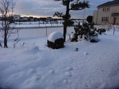 6:30に起床、早速防寒着を纏い、玄関を開けてみました。我が家の前は一面の銀世界。妻が昨日、門扉を開けておいてくれました。積雪そして凍結により扉が開かなくなることを心配したのでした。昨日の妻の除雪の後も5cm以上の積雪があったことが解るのです。 白大福も更にメタボに。我が家の積雪は30cm弱か。 雪の中で木瓜の花がけなげに。 台風の如き風が吹いたことが解るのです。ブロック塀の上部1m以上の所まで雪が張り付いていました。 幸い朝の気温が下がらなかった為、太陽光パネルの雪は既に2/3以上は滑り降りて発電を開始していました。パネル表面の汚れも雪が洗い落としてくれた様です。 我が家の前の道路を、近所の農家のAさんが大型トラクターで一気に除雪してくれました。 このあたりが、我が田舎のご近所の優しさに感謝なのです。私の非力では気の遠くなる作業になったのですが、人の優しさそして機械の力は素晴らしいのです。 我が家の中はもちろん人力。幸い凍結もなく、水分が多くなかったので助かりました。 しかしながら、雪国の方々の除雪の苦労を垣間見ることが出来たのです。 そして朝の陽光がビニールハウスで反射し、二つの太陽が我が家に光を。青空がいつもより美しいと感じられるのです。 この太陽が雪解けを早めて欲しいと願っているのです。
