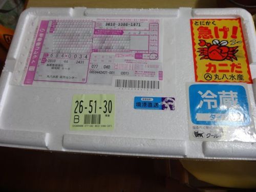 妻が通販で松葉がにを注文しました。そして土曜日に送られてくるはずでしたが・・・・・・。 到着したのは、昨日、日曜日の午前中。数十年ぶりの大雪により、宅急便屋さんから電話があり、土曜日の配達は出来ないと。ラベルには『とにかく急げ!』 と貼ってあったのですが自然には勝てません。電話の宅急便の方に、『頑張れ』と蟹に伝えて欲しいと話し電話を置いたのでした。生きた松葉がにがクール宅急便で漸く到着。 発泡スチロールの箱を開けると松葉がにが鎮座。長旅の疲れか、最初は口をパクパクのみ。 『とっとり 松葉がに』の血統証付き。そのうち元気を回復し、脚で蓋の箱を押し上げるほどに、いい加減に出してくれよと。 この日の夕飯にはもちろん活がにの刺身で。妻が花が咲いたように仕上げてくれました。口の中で甘く優しく溶けていったのです。 残りは茹でがにで。 味噌もたっぷり入っており、妻との沈黙の夕食の時間が続いたのでした。