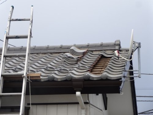 我が家も築35年弱を経過し、いろいろなところに傷みが出てきましたので、修理をお願いしています。まずは日本瓦のズレ。我が家の瓦は、昔の引っ掛け葺き工法の瓦?このズレは妻が発見しました。今回の我が家の修繕工事は内装が中心ですが、瓦のズレの修理も併せてお願いしたのです。ズレている瓦を剥がしたところ。多少の土が入っているようなので、少量の土を要所に入れる引掛馴染み工法ではないかと思われます。 下の垂木は年代を感じさせます。 工事完了。垂木に木片を打ち込みズレないように補強していただきました。写真を見ると、鬼瓦の下の漆喰部分に割れが発生している事が解ったのですが・・・。