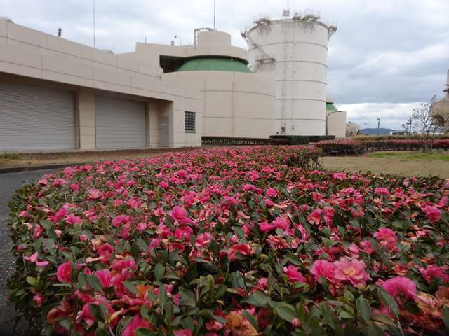 仕事で九州・福岡・姪浜近くにある下水処理場を訪ねました。処理場内の山茶花の花とその後ろに消化槽設備。 消化槽とは濃縮された下水汚泥を酸素のない状態で30日間滞留。汚泥は微生物の働きで分解され有機物が約半分になるのです。その際メタンガスを主成分とする消化ガスを発生。そのガスは、槽内を37度に暖める燃料やこのガスを燃焼させ発電を行うなどの有効利用が行われているのです。結婚式場ノートルダム マリノアの白亜の塔。 前方に浮かぶ島は能古島。福岡でも屈指の菜の花、桜、コスモス、水仙の名所で、満開のころは一年で最も混雑する島。そして能古島の左手には、糸島半島が。 右手には志賀島に通じる海ノ中道が。 山茶花の花のピンクの絨毯も美しかった。 そして夕方にはこの処理場を後にし、伊万里へ。伊万里では親友二名と久しぶりに再会し、酒を飲み交わす。新鮮な魚の刺身を楽しむ。醤油が東京から「My醤油」を持参。地元のたまり醤油は何故か甘くて、私の口には合わないので・・・・・。そして鍋も楽しむ。 部屋の床の間には商売繁盛の熊手が飾られていたのであった。