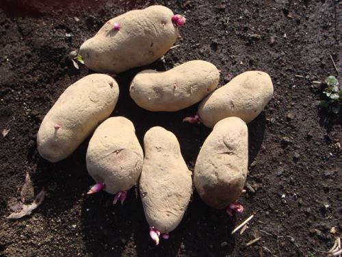 じゃが芋の植え付けを行いました。種芋は今年もネットで購入。ノーザンルビー。皮も中身もきれいなピンク色のじゃがいもで、アントシアニンを多く含み、調理後も色が落ちず綺麗なピンク色に仕上がる品種。形や大きさはメークインと似ていますが表面はつるっとしていて窪みも少ないのです。昨年収穫時の写真です。こちらはシャドークィーン。この品種もアントシアニン色素を含有する紫皮紫肉のばれいしょ品種で、カラフルポテトの代表的品種。皮も中身も鮮やかな紫色のじゃがいも。これも昨年の収穫時の写真。そしてインカも目覚め。原産地・南米アンデスのジャガイモを日本向けに改良したもの。鮮やかな黄色と、コロコロと小粒な姿、栗かサツマイモを思わせるホクホク感で、人気のある高級ジャガイモ。見事な黄色の断面。そしてシンシア。肉色は淡い黄色。くせがなく、煮くずれしにくく、味がしみやすいので、おでんに入れたり、煮物にしたり、どんな料理にも合う品種。約30cm間隔に芽のあるところを上に置いていきました。その種芋の間に一握りの化成肥料を。併せて鶏糞も一握り。覆土して植え付けは完了。これから約30日ほどすると新芽が10cm程度に成長してくれるのです。その頃が芽かきのタイミング。元気の良い芽を2~3本残してすべて欠くのです。一つの種イモから芽がたくさん出ると、小さな小イモがたくさんできて大きなイモが出来にくくなるためなのです。