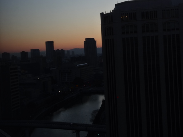 仕事で大阪・淀屋橋にある我が社の関西支社に前夜泊で行ってきました。翌朝のホテルの我が部屋からの景色です。漸く東の空が赤くなり出しました。刻々と色が変化しているのです。奈良の山の端(は)の赤さが増してきました。 そして『朝日のさしてやまのはいと近うなりたる』と枕草子のパクリです。そしてビルの間からの日の出。 まるでクレーンで太陽が吊り上げられてきたようでした。 土佐堀川と淀屋橋。 堂島方面。そして中之島フェスティバルタワー。
