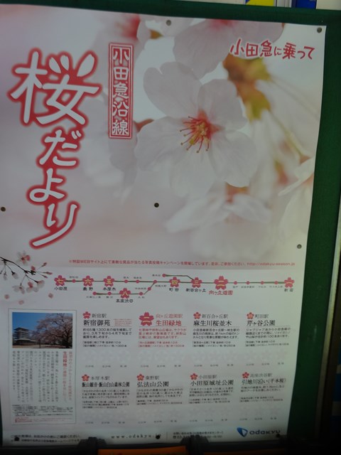 漸く東日本の各地から桜の開花のニュースが放送されています。我が地元の私鉄駅にも各種ポスターが貼られていました。小田急沿線 桜だより。 小田急沿線の桜の名所。 やまきた 桜まつり。山北駅の東側の樹齢約50年のソメイヨシノ約130本の桜並木は神奈川県の「かながわのまちなみ100選」に選ばれた御殿場線沿線で最大の桜並木。福島 花見山。花見山公園は、福島県福島市にある花卉園芸農家の私有地の名称。所有者が公園として市民に無料開放しており、特に春の花見シーズンには、多くの観光客を集めているとのこと。そして私が利用する都内JR駅構内のポスター。弘前城とさくら。 全国でも屈指の桜の名所として日本さくら名所100選、人と自然が織りなす日本の風景百選に選ばれている。ソメイヨシノ、シダレザクラなど約50種2,600本の桜が咲き誇る。北上。悠然と流れる北上川の河畔にある北上展勝地は、東北有数の桜の名所として知られ、「さくらの名所100選」「みちのく三大桜名所」に数えられています。珊瑚橋から2キロにわたる桜並木の他にも、約150種の様々な桜が、展勝地公園内293haに1万本あると言われ、4月中旬ごろに咲き始めるソメイヨシノから5月上旬のカスミザクラまで美しさを競います。角館。角館の桜は、弘前公園、北上展勝地と共に「みちのく3大桜名所」と言われています。角館の桜には、桧木内川堤のソメイヨシノと武家屋敷通りにある枝垂桜の2つがあります。桧木内川堤のソメイヨシノは、1934年(昭和9年)に現天皇(当時皇太子)誕生の記念として植えられたものが始まりで、現在では全長2キロ、約1万本の桜のトンネルとなっています。1975年には国の名勝指定を受けました。武家屋敷通りの枝垂桜は更に歴史が古く、1664年京都の公家が角館佐竹氏に嫁いてきた時に嫁入り道具の中に枝垂桜の苗が3本入っていたことがその始まりと言われています。現在約400本ある枝垂桜の中で153本が国天然記念物に指定されています。 高田。日本三大夜桜のひとつとして知られている高田城百万人観桜会の期間中は、約3000個のボンボリが設置される。高田城三重櫓のライトアップとボンボリに照らされた約4000本の桜が、お堀の水面に幻想的な風景を映し出す。 三春。三春滝桜は、福島県田村郡三春町大字滝字桜久保に所在する、樹齢推定1000年超のベニシダレザクラ(紅枝垂桜)の巨木。国の天然記念物。三春の滝桜、また単に滝桜とも呼ばれる。日本五大桜または三大巨桜の1つとして知られる。樹高12m、根回り11m、幹周り9.5m、枝張り東西22m・南北18m。 船岡・大河原。宮城県を代表する桜の名所・白石川堤一目千本桜と船岡城址公園の花見が大人気。一目千本桜は延長8.5kmの長い桜並木。 我が先輩のポスター。JR東日本は2014年4月から始まる大型観光キャンペーン「新潟デスティネーションキャンペーン(DC)」の宣伝用に女優の吉永小百合さんを起用し、新潟県上越市の高田公園の夜桜ポスター。 我が家の近くの桜の名所の日本大学藤沢高等学校に隣接する、日本大学生物資源科学部構内の桜並木も漸く開花を始めました。来週は長男のパートナーのご両親が初めて我が家を訪ねてくださいます。その日までこの桜並木の花も頑張ってもらい、ご案内したいのですが。