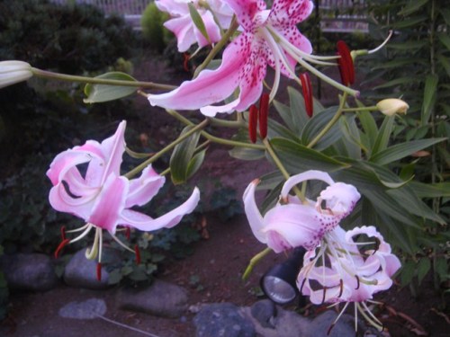 我が家の庭のカノコユリ(鹿の子百合)が満開を迎えています。和名はもちろん、花弁に鹿の子模様の斑点があることから。花弁が反り返る形等が海外とりわけヨーロッパでは人気の日本特有種なのです。この鹿の子百合は、天明と天宝年間の大飢饉の際には球根が食用とされ、多くの人が餓死を逃れたと。長く突き出したシベ、優雅に垂れ咲き、多くの花が斜め下、若しくは下向きに、花を咲かせていますがこの花だけは上向きに。鹿の斑点をぎっしり並べたような 「鹿の子模様」に似ているピンクのつぶつぶが特徴。 そしてこの日の我が家からの見事な朝焼けです。 時々刻々と変わる色の変化を楽しんだのです。