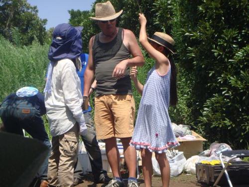 先週末は我がミツバチ農園で同僚とBBQを行いました。参加者は総勢13名。同僚男性6名、女性4名、奥様1名そして子供2人。奥様は遙々仙台から厚切りの牛タンを持ってきて下さいました。畑にターフテントを張りBBQの開始。炭火を2ヶ所に用意し、牛タン、我が農園の野菜、タマネギ、ナス、ピーマン、ニンニク、ジャガイモ・・・を焼いて楽しみました。厚切り牛タンはあっという間に完食。写真を撮る事も忘れて楽しんだのです。同市内に住む同僚がお子様2人を連れ今回初参加。途中、世話好きの同僚がプラスチックコップに鋏を入れ何かを作り出したのです。そして完成したのが約1.5mのソーメン流し。お子様二人も楽しそうに流れてくるソーメンを箸でGETしていたのでした。プロデューサーも満足げ。そして我が農園のスイカもその場で収穫し楽しんだのです。皆さん、甘くてシャリシャリして美味しいと、こちらもあっという間に完食。スイカを自宅に持ち帰る同僚も。楽しい時間はあっという間に過ぎ、16時前に宴はお開きとなりました。次回の農宴芋煮会を約束して解散したのでした。 そして翌朝は早朝から「強者どもが夢の跡」の後片付け。