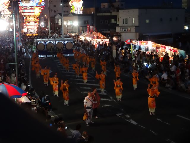 我が事業所での現場確認、打ち合わせ後はホテルにチェックイン。この日は五所川原・立佞武多(たちねぷた)祭りの最終日。協力会社の社長様から桟敷を予約してあるからと祭り観賞の招待を受けたのであった。ホテル前のエルムの街ショッピングセンターから、片道120円のシャトルバスにて祭り会場近くまで。そして徒歩にて祭り会場へ。五所川原駅前横の立佞武多小屋。シャッターが開けられ中には五農立佞武多が出番を待っていた。五農とは 青森県立 五所川原農林高等学校のこと。テーマは、「長慶天皇 御所川原伝説」。長慶天皇のまわりに5匹の竜が集まっていました。長慶天皇は、南北朝時代の第98代天皇にして、南朝の第3代天皇。そして隣にもう1機、 さかえ立佞武多 と。2000年に30人ほどの有志により結成されてこの会も今年で15年目とのこと。子供達を中心に今や500名を超える参加者を有し、祭り団体一番の人数となったと。手作りの立佞武多は市長賞を受賞した模様。立佞武多の館に向かって歩いていくと既に巨大ねぷたが館から外に出て駅に向かって進んでいました。「忠孝太鼓」の上部に、新たな立佞武多「三日月祈願 山中鹿之助」が飾られていました。山中鹿之助 幸盛(やまなか しかのすけ ゆきもり)は、戦国時代から安土桃山時代にかけての山陰地方の武将。尼子氏の家臣。実名は幸盛(ゆきもり)、幼名は甚次郎(じんじろう)。優れた武勇の持ち主で「山陰の麒麟児」の異名を取る。尼子十勇士の筆頭にして、尼子家再興のために「願わくば、我に七難八苦を与えたまえ」と三日月に祈った逸話は有名である。(ウィキペディアより) そして丁度、立佞武多の館から2014年の新作「国姓爺合戦 和籐内」が外に。高さは出口の大きさぎりぎり、当たり前であるが見事な設計。そして次ぎに出てきたのは、2012年の復興祈願「鹿嶋大明神と地震鯰」。最後に2013年 「陰陽 梵珠北斗星」。 今年の五所川原・ 立佞武多(たちねぷた)のポスター。五所川原市「立佞武多祭」とは、平成10年に約80年ぶりに復刻した青森県の五所川原市にて開催される夏祭り。【立佞武多】と呼ばれる、高さ約23m、重さ約19トンの巨大な山車が「ヤッテマレ!ヤッテマレ!」の掛け声のもと、五所川原市街地を練り歩くのです。青森市は「ねぶた」、五所川原、弘前は「ねぷた」と呼ばれているのです。立佞武多の館の横の市場の屋上と言う特等席が我々の予約席だったのです。既に多くの観光客が特等席に。招待下さった社長ご夫妻が歓迎してくれました。 巨大立佞武多が出番を待つ駅前は夕陽に輝きだしました。前日は雨のためこの巨大立佞武多3機の出番はなかったとのこと。主を送り出した立佞武多の館の壁も夕方の陽光に赤く染まっていました。 そして見事な、予想外の真っ赤な夕焼けが屋上特等席から。そして今年の最終日の立佞武多祭りのスタート。地元出身の歌手吉幾三の乗った移動ステージ車が各山車を先導し、生の歌声を聞かせてくれるたのでした。ヤテマレー… ヤテマレー… ヤテマレー… ヤテマレー…遠く聞こえて 津軽の古里に 笛と太鼓と 立ちねぷた街を見下ろし 歴史が通る 津軽平野は 五所川原ヤテマレー… ヤテマレー… 勝った戦の 立ちねぷた夏を彩る 風も踊れよ 立ちねぷた 立ちねぷた そして五所川原・ 立佞武多が続く。山中鹿之助が続く。 金色の三日月が輝く。 その先陣をきる巨大な2連太鼓『忠孝太鼓』 。直径2.4メートルの二連太鼓を叩く姿は見事。