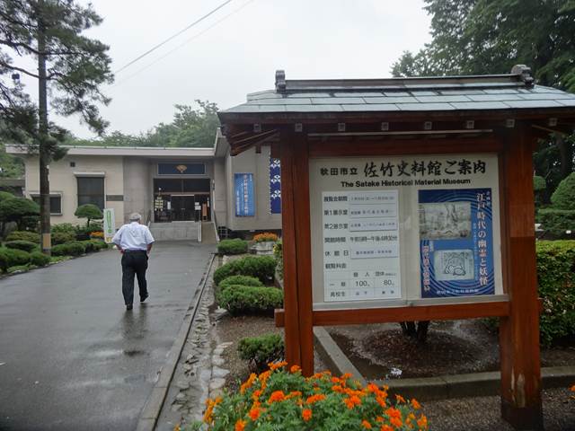 秋田・久保田城を訪ねる。まずは佐竹史料館に立ち寄る。 秋田藩主佐竹氏は、源氏の流れをくむ名門であり、全国でも古い歴史を持つ大名。本姓は源氏。家系は清和源氏の一家系 河内源氏の流れを汲み、新羅三郎義光を祖とする常陸源氏の嫡流。武田氏に代表される甲斐源氏と同族なのである。関ヶ原の合戦のあと、秋田に転封された佐竹義宣(よしのぶ)はここ久保田の地、神明山(現在の千秋公園)に新たに城を築き、城下町を建設。以来、秋田市はここ久保田城下町を中心として近世・近代都市として発展したと。入り口には、前日まで行われていた竿灯祭りの竿灯のミニチュアが飾られていた。 佐竹氏の家紋「扇に月」。『五本骨に月丸』の扇が3枚ずつ、3段にわたって計九枚縫い付けられていた。しかも皮革でこのような扇形を作製し、そこに金箔を貼ったものであると。この金が慶長の金を使ったというから純金による金彩。旗に竿を通すための輪になった部分を乳というが、通常綿布などでつくるが、佐竹氏ではこれも皮革に金箔で仕上げた金皮となっていた。 二代藩主の佐竹義隆。1626年、久保田初代藩主・佐竹義宣の養子となったとのこと。 歴代藩主の絵の前には見事な鎧が。 入り口受付の対面の壁には「秋田美人」のポスターが貼られていた。これは「解答編」ポスターとのこと。文字の部分が隠れていて、サイレントメッセージになっていたと。女性の口の形から何と言っているか文字を当てるのだと。そして秋田に美人が多いかについては諸説あるとのこと。例えば、秋田は日照時間が短いので色白、冬に乾燥しないので肌がしっとり、県内を流れる雄物川の水に漂白作用がある、白系ロシア人の血が混じっている、久保田藩(秋田藩)に移封された佐竹氏が常陸の国(今の茨城県)から美人ばかりを連れてきた……。とにかくいろいろな説があると。 旧秋田藩佐竹宗家の十四代当主で侯爵・佐竹義栄(さたけよしなが)氏の像。史料館前庭に建つ男性彫刻。 若山牧水・旅人父子の歌碑牧水の歌は、大正5年(1916) 3月から4月にかけて東北地方を回った「残雪行」の旅の途中、 秋田に立ち寄って千秋公園を散策した時の即興の作と。鶸(ひわ)めじろ山雀(やまがら)つばめなきしきり さくらはいまだひらかざるなり 牧水(右)旅さなか秋田にやどりし父のうた ふかきゑにしに今日きざまれぬ 旅人(左) 久保田城は矢留城、葛根城とも呼ばれていると。土地の関係上「秋田城」と呼ばれることもあったが、古代に出羽国府が置かれた秋田城とは別物であり場所も異なると。 千秋公園内にある二の丸跡より階段を登る。形式は平山城。久保田城は天守を持たず、かわりに櫓を設置したと。 木の裏には番所が。久保田城内で唯一の現存建築とのこと。パンフレットによると、長坂門の開閉と警備、火災の消火を担当していた部署と。久保田城復元本丸表門。久保田城本丸の厳重な守りを固めていた正門で、木造2階建て瓦葺きの櫓門。公園内は見事に整備されていた。「佐竹 義堯」(さたけ よしたか)の像。久保田藩12代藩主であり、久保田藩の最後の藩主とのこと。大正時代に旧家臣たちによって像が建立されたのだが、太平洋戦争で金属供出のためなくなってしまい、秋田市政100周年記念事業としてようやく復元されたものとのこと。表門の位置から見る本丸付近全景。左寄り奧に八幡神社、右寄り奧に佐竹氏銅像が。御隅櫓。本丸の北西の角にある3階建ての櫓。これも秋田市政100周年記念事業で復元された物。それほど大きくはないが、中は博物館になっていた。八幡秋田神社。本殿は天保三年(1830年)建立の文化財だったが、平成17年(2005年)1月に、放火により焼失そして再建されたと。再び城内より本丸表門。 木々の緑が雨に洗われて美しかった。