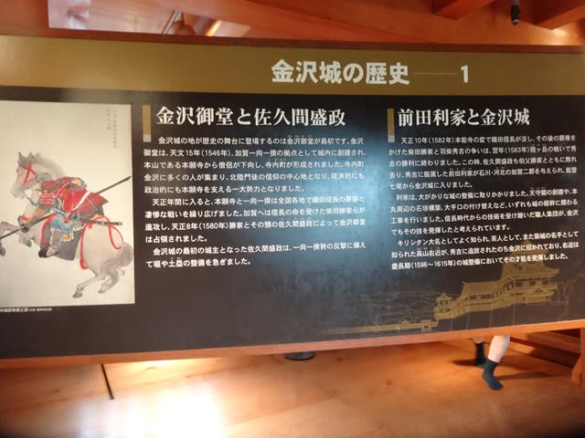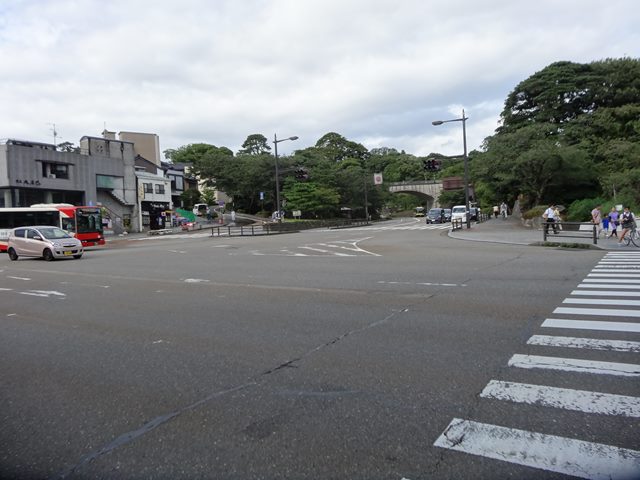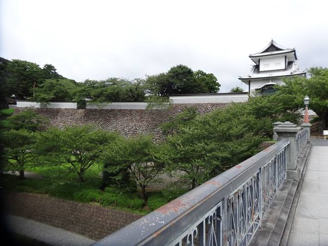 菱櫓の内部へ入る。金沢城の歴史を説明したパネル。 菱櫓からの石川門方面。菱櫓三層目から見た河北門。三十間長屋方面。 五十間長屋の二層目内部。極楽橋。二の丸と本丸の間の空堀に架けられ、その名前は尾山御坊の時代から伝わったものとも伝えられています。奥に見えるのは三十間長屋。 三十間長屋。当初は食器類を収めた倉庫であったが、江戸時代後期には武器・弾薬を収めていたと。宝暦9年(1759)の大火での焼失後、長く再建されまなかったが、安政5年(1858)に再建され、現存。重要文化財に指定されているのです。 江戸期には庭園や城郭建造物が存在していた玉泉院丸跡について、北陸新幹線金沢開業の平成27年(2015)春の完成を目指して公園整備が行われていました。 地中に埋蔵されている庭園遺構を保存し、その上に、絵図等を参考に池や島などを再現し、あわせて背後の意匠性に富んだ石垣群の修景や、庭園を回遊できる園路の整備、庭園の全景を眺められる休憩施設の建設など、広く玉泉院丸跡の魅力を感じられるように工事は進んでいました。 発掘調査や絵図等の史料に基づき、池泉回遊式の庭園を整備中。 中央公園のライオン像。中央公園は大槻伝蔵の屋敷跡とのこと。 石川近代文学館(石川四高記念館)。 中央公園にある親子の像。 『ひさかたの光に飛べと今放ついたでいえたる和と幸の鳥』の歌が刻まれていた。石川近代文学館(石川四高記念館)は、現在、正式には「四高記念文化交流館」となっていて正面から見て右側が有料ゾーンの「石川近代文学館」、左半分は無料ゾーンの「四高記念館(しこうきねんかん)」になっているのです。 香林坊交差点。 香林坊交差点にあったブロンズ像。タイトルは「走れ!」「金沢・まちなか彫刻作品・国際コンペティション2004」の最優秀賞作品とのこと。緑地帯の斜面に設置されている作品。芝生の上を力強く走っているような、その個性的な姿が印象的。香林坊にある金沢城と兼六園の立体ブロンズモデル。