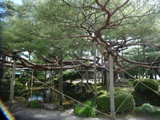 御花松 手向けの松。 美しい緑が拡がる。 一面を覆った苔の緑が美しい築山。山崎山。 山腹には白川御影石でつくられた五重の塔(御室の塔)が。また、山麓の岩間から流れ出る水は、約570mの曲水となって霞ヶ池に注いでいます。 曲水を清掃中の管理作業の方々の姿も。 石川県立伝統産業工芸館は開館前。 明治記念之標をズームで。明治政府ができたときにつくられた建国の祖“日本武尊(やまとたけるのみこと)像”。人物を模した大きな像としては、日本最古であると。明治10年西南戦争の戦没者の霊をなぐさめる加賀藩旧士族の記念碑。花見橋。橋から見る季節の花の眺めがすばらしいことから、この名前がついた木橋。 特に5月に満開を迎えるカキツバタの姿は名物の一つ。この他、夏の緑陰、秋の紅葉、冬の雪景も見逃せないのだと。 松に大きな傷が。太平洋戦争中、政府の指示で軍用機の燃料にするため、松脂を採取した痕だと。瓢池と左側に碧滝。右側は 「海石(かいせき)塔」。虫が喰ったような穴のあいた笠石で、六重に積み重ねられた高さ4.1mの塔兼六園の有名な噴水。この噴水は、園内の霞ヶ池を水源とし、池の水面との高低差による自然の水圧であがっていると。水の高さは約3.5mあり、霞ヶ池の水位の変化によって変わると。藩政末期、金沢城内の二ノ丸に水を引くため試作されたもの。日本で最古の噴水であると言われているとパンフレットに。「常磐ヶ岡」の池と滝。「林泉回遊式庭園」とは、池、築山、曲水、樹林などの移り変る景色を眺めながら一回りすると、一巻の絵巻物を見終わるという趣向で造られた庭園のことで、「兼六園」の中では、至る所で水の流れを見ることができるたのです。そしてほぼ兼六園内散策を制覇し、金沢城へ。