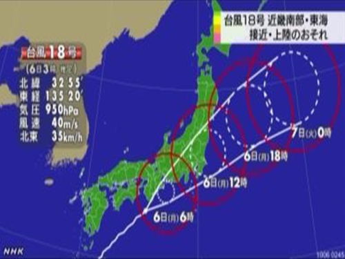 今週月曜日は6日朝に台風18号が浜松市に上陸、東海・関東を横切った。出勤時間の7時前後には我が家は豪雨。昨夕、妻も仕事のため、この朝のタクシーを予約しようと電話したところ予約は受け付けていないと。この豪雨では、最寄りの私鉄駅まで到着する間に全身ずぶ濡れ間違いなしなので午前中は自宅待機を決断。しかし妻は定時出社がMUSTとのことで、豪雨の中車で送ったのであった。6:55の雨量レーダー画像。真っ赤な豪雨が我が関東に迫っている事が確認できたのであった。 我が家の屋根の樋が詰まっているのか樋から雨が溢れていた。そして我が部屋の窓を流れ落ちる雨で我が家の前の温室の屋根のアルミ材もゆらゆらと。そして益々雨が激しくなったのであった。我が部屋から見える畑も池に変身。我が携帯にも豪雨情報が入ってきた。9:20過ぎには100mm/hrの豪雨が迫っていると。風も強くなり横殴りの豪雨が。我が家の前の道も川の如くに。そして漸く11時前には雨も上がったのであった。我が畑の野菜類は風よけに網を被せてあったので被害は殆ど無し。そしてカリフラワー等の苗には割り箸で添え木をしていたのであった。我が家の前のネギ畑も全面池に変身。海の方には青空も見えてきたので、慌てて支度をし自宅を出て最寄りの駅へ。しかし未だ運転再開の目処も立っていないと。地下鉄、相鉄線が乗り入れている隣の駅にバスにて移動することを決断し駅のロータリーへ戻る。折しも乗客を乗せたタクシーが到着したのでこの車に乗ろうとしたがこのタクシーは圏外タクシーである為否と。状況を強く説明し、何とか乗せてもらったのであった。しかし湘南台駅始発の2社の路線も運転再開は1時間以上かかると。やむなく喫茶店で運転再開を待つことを決断。そして12時半過ぎに開通。開通後の始発便は大混雑。よって見送り2本目に乗車し座席を確保。我が市と横浜市の境を流れる境川の水位も依然として高かったのであった。境川の避難判断水位を超えた為、氾濫の可能性があるとして、藤沢市の周辺流域では避難勧告が出されたのであった。 二俣川までは各駅停車の徐行運転。二俣川で急行に乗り換え横浜へ。横浜駅からは運転再開の東海道線で品川に向かったのであった。多摩川も依然として濁流が。そして2時過ぎに会社に何とか到着したのであった。
