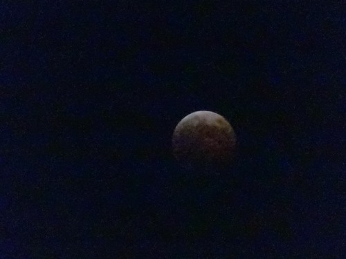 10月8日夜は皆既月食。折しも大阪に出張中で有り、同僚4人で居酒屋で懇親中。トイレに行った折、どの様になっているかと店を出て見ると皆既月食のまっただ中。赤銅色の月が夜空にぽっかり浮かんでいた。地球の大気によって太陽の光のうち波長の長い赤系の光が屈折・散乱されて本影の中に入るため、皆既月食でも通常、月は真っ暗にはならず暗い赤色(赤銅色)に見えるのだとホテルに戻った後のニュース解説で知る。絞りを手動にし、カメラを停車していたバイクの荷台に預け望遠で。次の皆既月食は2015年4月4日、皆既は約13分間継続するとのこと。