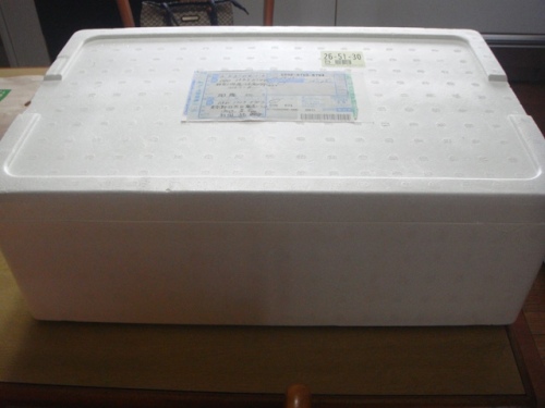下北、むつ市から同僚が巨大な鯛を送ってくれました。巨大な段ボール箱、クール宅急便にて。 発泡スチロールの蓋を開けて見ると巨大な鯛が横たわっていました。全長40cm以上、5Kg近くある大鯛。 協力会社の方々と陸奥湾で釣り上げた鯛とのこと。まだ眼は生きているが如し。 妻が悪戦苦闘して捌いてくれました。私は横で傍観者。 。湯引きの鯛刺皮を上にしてキッチンペーパーをかけ、して熱湯を注ぐ。皮が丸々って来たのです。 そして三枚開きの真ん中は塩焼きでいただきました。 吸い物も楽しませていただきました。 そして、もちろん刺身でも。桜色の天然物はとても身の締りがよく正しく美味。