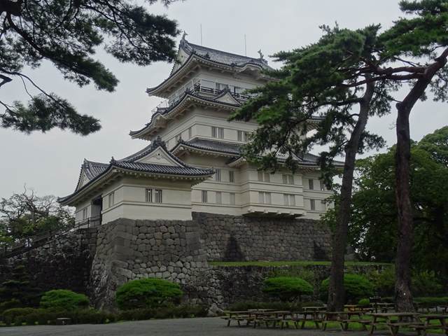 小田原城天守。三重四階の天守櫓に付櫓、渡櫓を取り付けた複合式の構成形式。構造は新式の層塔型である。昭和35年(1960)に地上38.7mの鉄筋コンクリート造で復興された。なお、最上階の高欄付き廻縁は復興に際して新に付けられたとのこと。 室町時代に大森氏の築いた城を明応4年(1495)、北条早雲が奪い、以後、北条氏5代約100年にわたる居城となり、関八州(関東8カ国)掌握の本城として拡張されていく。総構に守られた城は難攻不落と謳われ、中世城郭史上に例のない巨城の出現をみる。戦乱の世にあって小田原城は、上杉謙信、武田信玄の侵攻をかわし、秀吉も武力で小田原城を落とすことはできなかった。天正18年(1590)、秀吉の策略によって、北条氏は城を明け渡し滅亡したのであった。階段を上り天守閣へ。 スタンプをGET。天守閣頂上からの相模湾の眺め。遠く真鶴半島が見えた。 小田原駅も。 そして天守閣を後にし遊園地横を通る。遊園地には豆汽車や豆自動車、メリーカップなどの遊具が。報徳二宮神社(ほうとくにのみやじんじゃ)は、二宮尊徳を祀る神社。立派な庭園。 手入れがされていて見事。報徳二宮神社は栃木県日光市や神奈川県相模原市にもあるとのこと。日光市にある報徳二宮神社は、尊徳の終焉の地に鎮座で、小田原にある報徳二宮神社は、尊徳の生誕の地に鎮座。相模原市にある神社は小田原の分霊。社殿は小さかった。 二宮尊徳像ですが見慣れたものとは違う。見慣れているのは二宮金次郎像。再び小田原城へ戻る。銅門枡形南側に延びる堀。画面左端で途切れているが、これはもっと向こうの堀までつながっていたとのこと。 再び住吉橋を行きとは反対側から。 観光案内所には精巧な甲冑が展示されていた。 小田原駅へと向かう。路上マンホールの蓋。江戸時代の「酒匂川の渡しと、その背景に、市のシンボル「小田原城天守閣」および「鐘楼(または隅櫓?)」。市の木「クロマツ」、これらの上に 「箱根の山並み」、その山越しに望んだ「富士山」。かなり欲張りな蓋。 こちらは小田原城石垣と堀に浮かぶ蓮の葉。 そして小田原駅まで戻る。 駅のコンコース。 名物の巨大な小田原提灯。