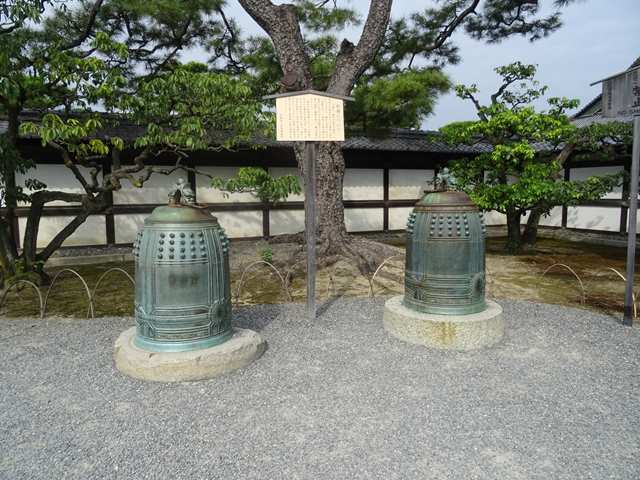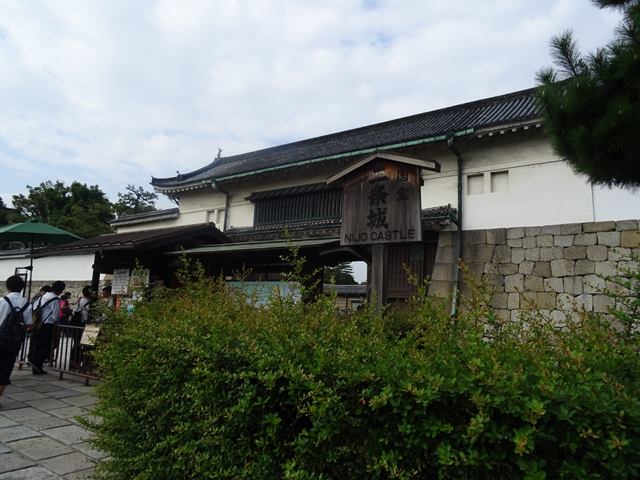 二の丸御殿を出て庭園へ向かう。2個の梵鐘。 この鐘は、薩摩、長州から攻められた際の非常事態に鳴らす警報の役割に使われたと。 そして梵鐘の後ろの松の幹を切り落とした部分から大きなキノコがニョッコリと。二の丸庭園側から二の丸御殿の廊下下に潜り鶯張りの床の音を聞く修学旅行の生徒達と引率の先生?。 見事な二の丸庭園。小堀遠州が作庭した池泉回遊式庭園。神仙蓬莱の世界を表した庭園と言われていると。黒書院を庭園側から。 本丸御殿への入り口 東橋。 本丸御殿入り口部の石垣。 本丸御殿の庭園側からの外観。 内堀には紅葉を始めたモミジが。 天守閣跡への階段。 階段を上り天守閣跡へ。ここには伏見城から移された五重五層(5階建て)の天守閣があり、二の丸御殿からも庭園越しに眺めることが出来たと。その天守閣も1750年(寛延3年)に雷が落ちて焼失してしまい、その後再建されず石垣だけが残されたと。天守閣跡から北東 比叡山が見えました。本丸御殿 車寄せ。 本丸は寛永3年、3代家光により増築したもの。 もとは5層の天守閣があったが、寛延3年雷火により焼失。また、天明8年には、大火による類焼で本丸内の殿舎もなくなってしまったと。 現在の建物は、もと京都御所にあった旧桂宮御殿を明治に、移し建てられたもの。 この建物は弘化4年に、建てられたもので、宮御殿の遺構としては完全な形で残っている唯一のものであると。 内堀沿いを東大手門に向かって歩く。西橋と天守閣石垣が。 香雲亭と枯山水。 東南隅櫓を唐門近くから。 そして南門内側。そして見学を終え、足早に東大手門より出て、堀川通りを渡り京都駅行きのバスに乗ったのです。