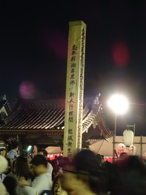 長男夫婦の住む大森の近くの池上・本門寺のお会式を見物しに妻と行ってきました。長男の家に立ち寄った後、徒歩にて本門寺に向かう。途中、これから練り歩く万灯があちこちに。 大森銀杏(ぎんなん)通り会の垂れ幕。お祭りの寄付一覧掲示板。カラフルな万灯。 多くの屋台店が道の両脇に。見物客でごった返す中、漸く池上本門寺総門に辿り着く。 10月11日、12日、13日 「御會式」 の表示とDJポリス?もちろん、DJポリス(ディージェイポリス)は2013年6月4日にサッカー日本代表が2014 FIFAワールドカップ・アジア予選においてワールドカップ出場を決めた夜、渋谷駅前で、大勢のサポーターにユーモアを交えた話術でルールを守るよう呼びかけた警視庁機動隊員に対する愛称。総門を潜る。日蓮聖人が亡くなった10月13日を中心に、全国各地の日蓮宗寺院では、お会式(おえしき)が営まれまますが、日蓮聖人が御入滅された霊跡である池上本門寺のお会式がもっとも盛大に行われるのです。午後6時頃より、池上徳持会舘から本門寺までの約2キロにわたって百数十講中、総勢約三千人もの万灯練り行列が池上の町を練り歩き、深夜にいたるまで賑やかな一日となるのです。池上本門寺正面の総門をくぐり、加藤清正公の築造寄進による批経難持坂(しきょうなんじざか)を登る。 振り返ると階段もごった返していた。しかしここが日本人、きちんと並び追い越す人も無く整然と。 仁王門内の左右には、阿吽の朱色の仁王像が、祭りの見学者を睨み付けていた。