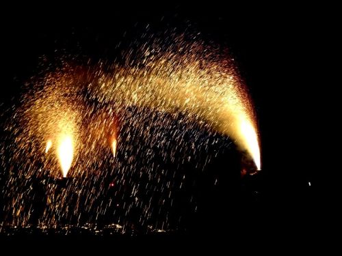 そしていよいよ待ちに待った今年の花火のスタートです。まずは手筒花火。手筒花火は、1メートルほどの竹筒に火薬を詰め、それを男衆が抱えながら行う花火。 だんだんと手筒花火の数が増えて行きました。 点火すると、轟音と共にオレンジ色の火柱が上がり、仁王立ちの状態で打ち上げ。最後には「はね」と呼ばれる、衝撃音と共に手筒の底が破裂する爆発によって幕を閉じるのです。舞台の上には大きな火の粉が飛び散っていました。打ち上げる男衆の姿も偶然に?映っていました。いろいろとカメラの露出、シャッタースピードを変えTRY&ERROR。柱は最後には10メートル近くにもなり、ど迫力そのもの。そして席に戻り、打ち上げ花火を楽しんだのです。大、中、小のスターマインが息つく暇もなく次々と打ち上がったのです。音楽に連動し10分間で6,000連発を打ち上げるビッグプレミアムスターマイン。夜空を彩る大輪の二尺玉、湖面に映る水上花火と、印旛沼湖畔に咲き誇る百花繚乱を楽しんだのです。 生後7ヶ月の男子の孫も花火の音に驚くことなく、空を見上げて花火を楽しんでいたのです。そして3歳前の孫娘は良く聞き取れませんでしたが打ち上げる大きな音と花開く花火に声を出して。実は、二人とも既に隅田川花火大会を事前に楽しんだとのこと。 三脚にデジカメを固定し花火を見ながらシャッターを押しまくりましたがズームではなかなか・・・・・・。 そして湖上からの水上スターマイン「水辺の花の舞」。風車の後ろから突然の開始。 ズーム倍率もTRY&ERRORにて。 そして再び特大スターマインの連続。 様々な大きさと色の菊の花が次々と。 そして締めには関東最大級の二尺玉花火が打ち上がりました。 事前に二尺玉花火は直径60cm弱、打ち上げ高さは500m、開花時の大きさは250m近くになるとの案内嬢の声が。カメラに入りきれないほどの巨大な花火が目の前に広がったのです。そして黄色の筋が空一面に拡がり地上に舞い降りて来たのです。来年の余韻を残して佐倉市民花火大会2016はその幕を閉じたのでした。 そして混雑を避けるため、しばし席に留まる。そして帰路も往路と同じ道をゆっくりと余韻を味わいながら。屋台や出店の最後の必死の呼び込みがいたる店でも。 途中、踏切近くの道路横断場所で大渋滞、しばし動けず交通整理員の従う。そして漸く京成臼井駅に到着し、電車に乗りホテルに戻ったのです。 今年も日本風情あふれるの夏の風物詩「花火」そして「大切な人々と行く大切な一日」を大いに楽しませていただいたのです。ドーンと言う大きな音に心が踊り、夜空に花咲く色とりどりの輝きに魅了されたのです。一方では、夏の夜空に色鮮やかな大輪の花を咲かせ、そして一瞬にしてぱっと散るその姿は、「もののあはれ」を感じている自分がいたのです。 Fさんご夫妻、今年もお招きそしてご準備ありがとうございました。幼い孫達にもきっと夏の思い出が一つ増えた事、間違い無しなのです。そして来年は更に我が家には孫も増え、この花火大会もますます賑やかになりそうなのです。ありがとうございました。そして来年もよろしくお願いいたします。 そして、たった今私の部屋の背中のテレビでは、「イチローは記録達成まで残り1本で迎えた試合に6番・中堅で先発出場。第3打席までは凡退したが、七回の第4打席で右翼フェンス直撃の三塁打を放ってメジャー通算3000本安打の大台に到達した」と言うニュースが。オリンピックに隠れてしまい報道は小さくなってしまいましたがこちらも日本全国で祝砲の「巨大打ち上げ花火」 が上がっていること間違い無しなのです。