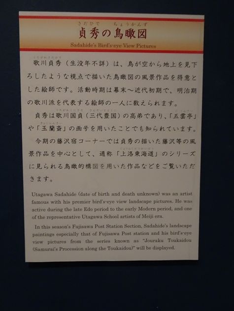 次に藤沢宿コーナーへ。ここには歌川貞秀(うたがわ さだひで、生没年不詳)の鳥瞰図が展示されていた。歌川貞秀とは、江戸時代後期から明治時代にかけての浮世絵師。初代歌川国貞(三代豊国)の高弟であり、始めは五雲亭、後に玉蘭、玉蘭斎、玉蘭主人、一玉斎、玉翁などと号したと。横浜絵(よこはまえ)の第一人者といわれ、精密で鳥瞰式の一覧図や合巻(草双紙)の挿絵を描いたことで知られていると。横浜絵とは、江戸時代から明治時代に描かれた浮世絵の様式のひとつ。主に横浜港、商館風建物、異国人の風俗などが描かれており、同じく異国趣味を題材にしていた長崎絵に準じてこう呼ばれるようになったとのこと。㉒「歌川貞秀 東海道名所之内 ふぢさは 遊行寺」 『文久3年(1863)の十四代将軍徳川家茂による上洛が行われると、これを題材とした 五十三次シリーズがいくつも発行されました。これらは「上洛東海道」や「行列東海道」などと 呼ばれ、爆発的な売れ行きで多くの版を重ね、幕末期の政情に対する庶民の関心の高さを 物語っています。 藤沢宿の遊行寺の前を通る一行が描かれています。題字の横には左右に「江戸の方」「鎌倉道」 遊行寺横の林には説教師(人々に語り継がれてきた物語)【小栗判官】に関連する「小栗道」 「小栗十騎の墓(小栗判官の部下の墓)」、右下の江の島一の鳥居付近には「江の嶋みち」と いった表記が見られ、貞秀が地誌的な内容に意識が向いている様子がうかがえます。』㉓「歌川貞秀 東海道名所ノ内 由井ヶ浜」 『「上洛東海道」シリーズの一枚です。波打ち際に立っているのが 将軍家茂(いえもち)と思われますが、実際に家茂がこの場所に 立つことはなかったと考えられます。 由比ヶ浜の鶴岡八幡宮の一ノ鳥居の前あたりから、稲村ヶ崎、腰越、江の島、 さらには遠く箱根山、二子岳、下田、そして富士を望む景観が描かれています。 また、画面中央を分けるように描かれた松の枝や、ふたつの大波など、斬新な構図を 思いのままに描いた初代広重顔負けの構成力にも、貞秀の絵師としての非凡さが 見て取れます。』㉔「歌川国網 東海道 白須賀」 『上洛東海道シリーズからの一枚で、海岸に沿って東海道を進む一行が描かれています。 行列の進む道は遠州灘を一望できる名勝地の潮見坂と思われます。潮見坂は京都から 江戸に進む際に初めて富士山を見ることが出来る場所として知られ、絵にも「冨士見松」 と名のついた松が見られます。』㉕「歌川貞秀 三国第一山之図(富士山真景)」 『富士の五合目から頂上までを俯瞰的に画面いっぱいに描いた作品。ごつごつとした 茶色の岩肌にて富士を表現しているところが特徴的で、登山道には小さく人々が 画きこまれています。 また、主だった地点や名所などが事細かに記されており、富士登山の案内図の要素も 兼ね備えたものとなっています。 画中に「登山成就時玉瀾斎貞秀写」とあり、貞秀が富士に初登山の際に画かれた可能性も 指摘されています。』㉖「歌川貞秀 新版東海道五十三次行列雙六」 『将軍家茂による上洛に際して作られた東海道双六で、東海道を埋め尽くすように行列の 人々が画かれた点が特徴の作品です。振り出しの江戸日本橋から、上がりの京都までの 道のりが全て一つの画面に盛り込められており、各土地の位置については実景とは 異なるものの、まるで鳥の目線で東海道を旅する気分を味わえる双六となっています。 画面中央には富士山が据えられ、その右下には藤沢宿見られます。さらに左下に目線を 移すと江の島も画かれていることがわかります。』 「東海道五十三次各宿場の風景図を染め付けた鉢」。『鉢の外側の日本橋から始まって、終わりの三條(京都)は見込み(内側)の中央になります。 戸塚宿は大橋(吉田大橋)と茶屋(こめや)の軒、藤沢宿は遊行寺・遊行寺橋・江の島 一の鳥居が描かれ、図柄から歌川広重の東海道五十三次が人気を呼んだ天保年間以降に 制作された作品と思われます。㉘「月岡芳年 東海道御幸之図」 『明治元年(1868)に制作された「西京」(京都)から「東京府」に至る、明治天皇の 東幸の様子を描いた作品。東海道の各宿が、ひとコマずつ双六風に描かれていますが、 到着地点の「東京府」のコマは日本橋ではなく江戸城となっています。 また人物は簡略化され、全てのコマが鳥瞰的な視点で描かれています。』そして次に、藤沢宿コーナーへ。藤沢宿は、東海道五十三次の6番目の宿場。『東海道五十三次整備以前から清浄光寺(遊行寺)の門前町として栄え、後北条時代は小田原城と支城の江戸城の桜田門、八王子城、玉縄城をつなぐ小田原街道の分岐点だった。境川に架かる大鋸(だいぎり)橋(現遊行寺橋)を境に、江戸側(東岸)の大鋸町は相模国鎌倉郡、京都側(西岸)の大久保町、坂戸町は同国高座郡に属した。 清浄光寺(通称:遊行寺)が近くにあり、手前の大鋸橋の京都側南東には江島神社の一の鳥居があり、ここから絵の手前右手へ江の島道が約1里(約4km)の距