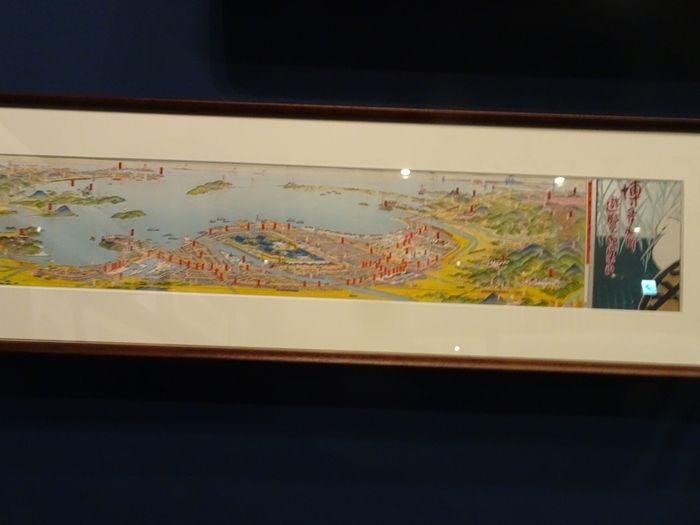 更に「空から見る相模と日本 鳥瞰図の系譜」を展示を楽しむ。「吉田初三郎 水野旅館を中心とせる博多名所遊覧図絵」昭和2年(1927)『博多湾を中心に、博多の街の観光名所を細かに紹介していますが、その中心にひときわ大きく、この図のスポンサー、東中州の「水野旅館」が描かれています。』「吉田初三郎 天草全島名所交通鳥瞰図」昭和7年(1932)『天草の島々は現在、雲仙天草国立公園となっています。ゆったりとした島々の間に、リズミカルな航路線が美しい絵図です。』「吉田初三郎 鹿児島市鳥瞰図」昭和10年(1935)『港を中心とした鹿児島市街の図。おだやかな桜島を遠景に、官公庁や図書館公会堂などが細かに描かれています。「吉田初三郎 景勝の長崎」昭和9年(1934)『長崎港を中心に描かれた観光地図。手前の造船施設や港に浮かぶ舟の姿など、原爆被害を受ける以前の様相を伝える貴重な資料です。』立神の海岸には立派なドッグ(造船施設)は現在も変わらず、三菱重工の造船所があります。「吉田初三郎 小樽市鳥瞰図」昭和6年(1931)『港を囲むように広がる小樽の街並みは、「手前に海、背後に山」を理想とした初三郎好みの地形となっています。昭和初期の小樽は、貿易港を備え持つ経済都市として発展し、当時の札幌より人口が多かったそうです。特に、色内地には、日本銀行を初め金融機関が集中し「北のウォール街とも称されました。』小樽港の周辺を接写で。「吉田初三郎 上川町鳥瞰図(国立公園大雪山層雲峡)」昭和27年(1952)『「旭川市を中心とせる名所交通鳥瞰図」で描かれていた層雲峡を北側から見る視点で描いています。右手前には上川町の街並みが描かれ、後景に層雲峡と大倉山がそびえています。』赤い屋根の層雲閣周辺を接写で。「吉田初三郎 炭都飯塚市鳥瞰図」昭和8年(1933)『福岡県飯塚市は筑豊炭田の主要な炭鉱があった街で、炭都と呼ばれていました。市内にはいくつもの鉱業所が描かれています。』「忠隈鉱業所」の文字が。筑豊の象徴二連ボタ山の麓に広がる「住友忠隈炭鉱」の姿が。「吉田初三郎 琵琶湖名所鳥瞰図」昭和元年(1925)『左端の浜大津(太湖汽船の本拠地)を起点に、琵琶湖をすべるように行き交う客船「みどり丸」と「竹生島丸」の遊覧航路をえがいています。』比叡山の根本中堂の姿が。『吉田初三郎 小田原急行鉄道沿線名所案内』昭和2年(1927)ボタンを押すと沿線の名所の説明箇所にランプが。「吉田初三郎 小田原急行鉄道沿線名所図絵」昭和2年(1927)『小田原小田急線の開通に際して造られた絵図。図中の線路は新宿から小田原まで一直線にデフォリメされています。』1929年に開通する江ノ島線も、既に点線で描かれています。59「吉田初三郎 大連」の表紙は大連埠頭の絵画。㊵「吉田初三郎 朝鮮金剛山交通大鳥瞰図」昭和4年(1929)「吉田初三郎 鳥瞰図」」数々(複製)㊶「歌川貞秀 富士山真景全図」嘉永元年(1848)鳥瞰的な画法が得意な歌川貞秀ならではの、富士山をほぼ河口の真上から描いた作品。「吉田初三郎 湘南電鉄沿線名所図絵」昭和5年(1930)湘南電気鉄道は京浜急行電鉄の前身の一つで、大正14年(1925)に会社設立。昭和5年(1930)4月1日に、黄金町駅-浦賀駅間、および金沢八景駅-湘南逗子駅の路線を標準軌で開業横浜~浦賀間で営業を開始した際の発行絵図です。金沢八景駅から2本に分かれる湘南電気鉄道。「湘南電気鉄道 デ1形」京浜急行電鉄の前身のひとつである湘南電気鉄道が昭和5年(1930)4月、開業のために25輌用意した川崎車輌製セミクロスシート車。神奈川県の鳥瞰図・神奈川観光図絵。東京湾の上空から、横浜~三浦半島方面。相模湾沿岸と大山、箱根方面。「京浜・湘南電鉄沿線案内図絵」『湘南電鉄は1933年4月には品川-浦賀間で京浜電気鉄道と相互に直通運転を開始しました。しかし横須賀線の延伸による競合などにより合理化をせまられ、1941年11月に資本関係があった京浜電気鉄道、湘南半島自動車との三社合併を行い、湘南電気鉄道は解散しました。合併後の京浜電気鉄道が現在の京浜急行電鉄の前身です。』 ・・・つづく・・・