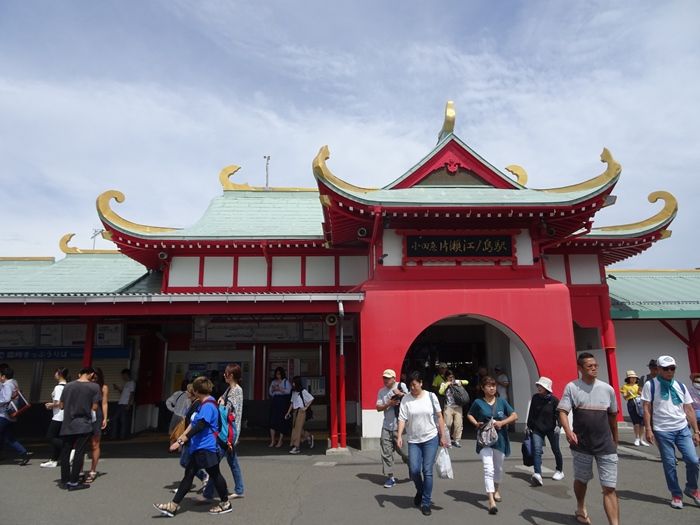 7月8日(日)のこの日は江の島の江島神社の境内社(けいだいしゃ)である八坂神社の例祭へ妻と行って来ました。この八坂神社の例祭は、別名「江の島の天王祭」・「神輿海上渡御」と呼ばれ、湘南を代表する夏祭りとして神奈川の祭50選にも選ばれるなど、人気の夏祭りなのです。小田急線でいつもの竜宮城の如き片瀬江ノ島駅へ。現在、片瀬江ノ島駅の構内は工事中、しかし外側はいつもの竜宮城。境川に架かる片瀬橋を渡る。片瀬橋中央付近に「雲の形」と命名された像が。私の目には若い女性の裸像に見えるのですが。境川に架かる弁天橋からの江の島。手前は国道134号線の片瀬橋。境川の上流方面。国道134号線の下の地下道を歩く。地下道には葛飾北斎 富嶽三十六景 相州江の島の浮世絵が。片瀬浜から見た春の江の島の風景。萌え出る若葉と江ノ島弁天にいたる参道、両岸の茶店や家並みが細かく描かれている。境川から出た土砂が島まで続き、干潮の時は昔から歩けたことがこの図からも解るのです。ネット情報によると、江の島が干潮時に歩いて渡れる様になったのは建保4年(1216)だと。その後長く干潮時には歩いて渡り、満潮時には渡し舟か人足が背負って渡っていたと。片瀬側の州鼻から江の島口に始めて村営の桟橋が架けられたのは明治24年であったと。すなわち、それまでは、フランスのモンサンミッシェルと同じように引き潮を待って歩いて渡ったり、負越賃(おいこしちん)を取って背負い渡しで渡っていたのだと。人道橋・江の島弁天橋を歩く。この左手には車道橋・江の島大橋が。江の島大橋は江の島で開催される2020年・東京五輪セーリング競技に合わせ、江の島と片瀬海岸を結ぶここ「江の島大橋」を現在の2車線から3車線に増やす工事が既に開始されていた。そして島へと続く人道橋・江の島弁天橋の入り口には大きな灯籠、そして龍が。江ノ島が出来た時の、五頭龍と天女(弁天様)の伝説が『江島縁起』にあるとのこと。本来7月14日であった祭日は、近年7月14日に近い毎年7月の第2日曜日・祝日(海の日)にこの天王祭が行われるようになり、多くの観光客がこの祭りを楽しみに江の島へ訪れるようになったのです。江ノ島弁天橋の「名勝及史跡 江ノ島」と刻まれた石碑とその奥に江の島の姿が。 人道橋・江の島弁天橋を歩く。この日は残念ながら富士山は雲に隠れていた。正面に八坂神社の幟が。八坂神社は、江の島の辺津宮にある江島神社の境内末社。臂弁財天と妙音弁財天が安置されている奉安殿の隣にある神社。江の島弁天橋を渡ってすぐにあるのが青銅製の鳥居。この鳥居は、1747年(延享4年)に建立され、1821年(文政4年)に再建されたもの。鋳物師:粉川市正藤原国信、世話人:浅草新鳥越の八百屋喜四郎、願主:新吉原の扇屋宇衛門、大黒屋勘四郎、松葉屋半蔵といった名が銘文に刻まれている。寄進者の中には花魁(おいらん)代々山という名もあるとのこと。この鳥居から、瑞心門前の朱塗りの鳥居までが江島神社の門前町で、旅館、土産物屋、食堂などが並んでいるのである。鳥居には龍が施された「江島大明神」の額が掲げられているが、以前は「大弁財天」という額が掲げられていたと。鳥居をくぐらず、左の小路を入ると、民宿、魚屋、八百屋、釣り餌屋、食堂などが並ぶ昔ながらの町並みが残されているのであった。右手に岩本楼。江の島を代表する旅館。かつては、岩谷本宮の別当寺であったと。八坂神社祭典のお花看板。寄付した方のお名前と金額が貼られていた。「江の島の天王祭」の今年のポスター。祭典期間は7/3そして7/7、7/8の3日間。「丸焼きたこせんべい」が大人気の「あさひ本店」には早朝から既に列が。江島神社の朱の鳥居が前方に。江島神社は日本三大弁財天(弁才天)の1つ(他の2つは竹生島の宝厳寺と宮島の厳島神社)。 江戸時代までは弁財天を祀っていることから、江島弁天・江島明神と呼ばれていたと。昭和34年に日本初の屋外エスカレーターとして設置された「江の島エスカー」。高低差46mの道のりを全長106m、4連で結ぶ。頂上までわずか4分で辿りつけると。竜宮城を模して建てられたという瑞心門。前には天王祭用の小動神社傘下の山車が2基。蟇石(がまいし)と無熱池(むねつち)。瑞心門の左側にある伝説の蟇石。その下にある池は無熱池。伝説によると、鶴岡八幡宮の供僧で慈悲上人と呼ばれた良真が、江の島で修業していると蟇(がま)がその邪魔をした。しかし、良真の法力念力によって蟇は石とされてしまったと。無熱池はインドに伝わる伝説の池を真似たもので、龍が住みつき、どんな干ばつのときでも」水が涸れたことがないと伝わる池。階段を登り瑞心門を潜ると正面には弁財天童子像が。江島神社には辺津宮、辺津宮奉安殿、中津宮、奥津宮などの建物がある。七月八日 八坂神社 神幸祭 の文字が。江島神社の手水舎が階段の途中に。辺津宮に到着すると、辺津宮境内では御神輿の発輿祭(はつよさい)が既に始まっていた。 発輿祭は御輿、山車や神式葬儀の