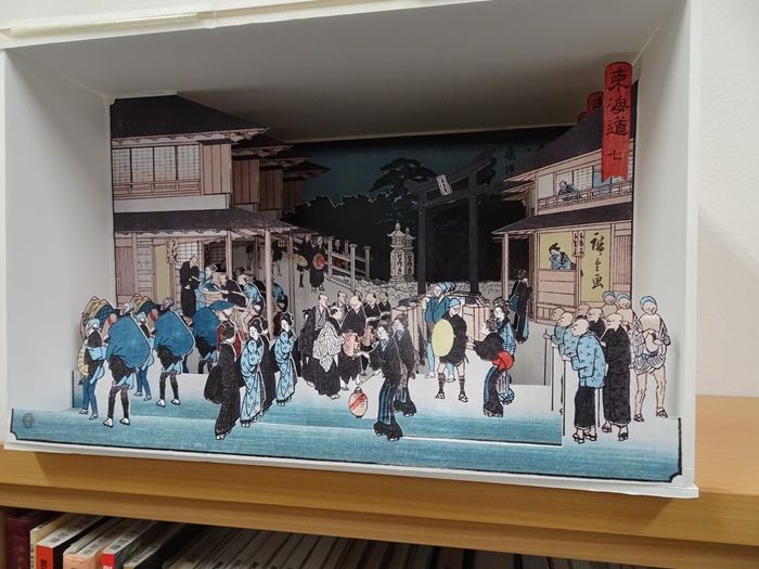 「空から見る相模と日本 鳥瞰図の系譜」の観賞を終えライブラリー&パネルコーナーへ。 「初代歌川広重 東海道五十三次 藤沢(隷書東海道)」の遠近法を企図した立体浮世絵。藤沢市・藤澤浮世絵館案内パネル。「主要な絵師の生没年と系譜」。「絵師の系譜」歌川豊春を祖とする浮世絵界の最大派閥である歌川派。歌川広重、歌川豊国、歌川国政、歌川国芳…。歌川派の有名絵師は例を挙げたらきりなし。歌川派は豊春の門人であった豊国と豊広から大きく広がって行った事が解るのであった。有名な絵師なら数名は解ったが、大半の絵師は聞いたことも見たこともありませんでした。「初代歌川広重 東海道五十三次之内 藤沢 遊行寺(保栄堂版)」。「歌川広重 東海道七 五十三次の内 藤澤(四ツ谷の立場」。浮世絵版画が出来るまでの説明コーナー。浮世絵(木版画)を作る道具たち。彫刻刀、刷毛、バレン、ブラシ・・・・。浮世絵の出版の構造と役割。浮世絵制作最大の特徴は、出版社にあたる版元の指示のもと、絵師、彫師、摺師の分業体制にある。特に、錦絵のような多色摺になると、彫と摺に今では考えられないほど緻密な手間ひまをかけていた。絵師がイメージした世界を具現化するには、彫師、摺師の名人芸ともいえる高い技術が不可欠なのである。浮世絵版画のできるまで。浮世絵の場合、特徴的なのは、この「下絵を描く」、「版木を彫る」、「紙に摺る」という3つのプロセスが、それぞれ専門職として分業化されている、という点。各プロセスごとに、「絵を描く専門家」、「版木を彫る専門家」、「紙に摺る専門家」がいて、順に絵師、彫師、摺師と呼ばれているのだ。絵師は、版元の依頼を受けて下絵となる「画稿(がこう)」という下絵を墨一色で描き、次に決定稿となる「版下絵」を制作する。彫師は、版下絵から主版を彫り、数枚複写したもの(校合摺)に絵師が色ごとに朱色で指定して行く。絵師の「色さし」に沿って「色版」を彫る。浮世絵では顔や頭髪の彫に最も高度な技術を要したが、絵師による版下絵は簡単な線で描写された程度である。髪の毛の1本1本に至るまで、細部の彫については彫師のセンスと力量に委ねられていた。色版のずれを防ぐため最初に基準となる主版を、次に色版の順に摺り重ねた。色版は仕上がりの美しさを優先し、摺り面積の小さい色の順に、薄い色から優先して摺られた。絵と色毎の版木(右)-1絵と色毎の版木(右)-2そして神奈川沖浪裏(かながわおきなみうら)の完成。『「神奈川沖浪裏」は、葛飾北斎の名所浮世絵揃物『富嶽三十六景』全46図中の1図。「凱風快晴」「山下白雨」と合わせて三大役物と呼ばれる同シリーズ中の傑作で、画業全体を通して見ても最も広く世界に知られている代表作。さらに加えて、世界で知られる最も有名な日本美術作品の一つでもある。凶暴なまでに高く激しく渦巻く波濤と、波に揉まれる3艘の舟、それらを目の前にしつつ、うねる波間から遥か彼方にある富士の山を垣間見るという、劇的な構図をとっている。一筋一筋の水の流れ、波濤のうねり、波に沿わせた舟の動き、富士山のなだらかな稜線といったものはすべて、幾重にも折り重なる対数螺旋の構成要素となっている。』パソコンコーナーも。藤沢市の江の島、遊行寺の浮世絵が衝立で。「 歌川芳員 東海道五十三次之内 藤沢(東海道五十三會)」『歌川芳員の東海道五十三次会は各地の説話をユーモアある表現で描いています。藤沢では、若侍と馬が囲碁を打っています。これは、鬼鹿毛乗馬の段を戯画として描き替えたもので、横にいる女性は照手姫でしょう。馬の浴衣が轡(くつわ)なのがご愛嬌です。』東海道名所案内雙陸(すごろく)。藤沢市藤沢浮世絵館所蔵作品集も販売中。そして展示会場を後にしたが、7月31日から全てのコーナーにおいて展示品の全部又は一部の入れ替えが行われるとのことなので、もう一度訪ねたいと思ったのであった。そして藤沢浮世絵館のエレベータホール、通路に展示されている浮世絵の部分拡大絵を写真撮影。「月岡芳年 今様げんじ江之嶋兒ヶ淵」『月岡芳年(1839-1892)は、歌川国芳の門人で、国芳の武者絵の画風を受け継ぎ、怪奇画、歴史画を得意とします。作品は「源氏絵」で、『偐紫田舎源氏』の主人公、光の君が江の島へ訪れ、稚児ヶ淵で海女たちの鮑取りを見物しているという見立絵です。版の色数も多く、空摺(からずり)の技法も入念に駆使されています。大判縦3枚続。制作時期:元治元年(1864)5月。』「二代歌川国貞&二代目広重 合筆 東海道名所之内 江之島 文久三年四月」『将軍が江の島の岩屋の前で、海女の親子が海中から鮑(あわび)を取ってくるようすを上覧している場面。ただし、実際に家茂が上洛の途中で江の島へ寄った事実はなく、江の島にゆかりの源頼朝に仮託したものと。画面中央の波を境に、陸上のようすを二代広重が、海中のようすを二代国貞が描いており、人物が得意な二代国貞、風景描写に長けた広重が、それぞれ