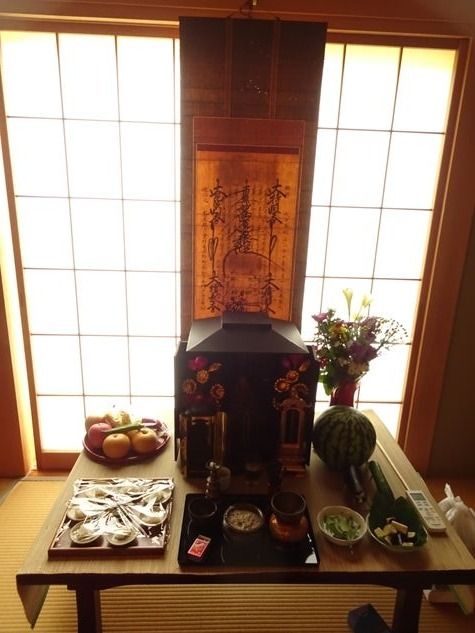14日(火)に我が実家のお盆のお参りに夫婦で行って来ました。我が実家では13日(月)に迎え日(盆入り)を行い、15日(水)に送り火(盆開け)を行いました。今年の我が実家の盆棚(精霊棚)です。盆入りの8月13日の夕方には、先祖の霊が迷わないように迎え火を焚きます。我が実家の迎え火は家の門の内側で行うのです。30~40cm四方の盛り土(砂盛り)をして線香をあげます。盛り土には盆様が乗ってくるといいキューリやナスで作った馬や牛を置き、その横でオガラを折って積み重ね、火をつけて燃やし、迎え火として先祖の霊を迎えます。オガラは麻の皮をはいだあとに残る芯の部分のこと。麻は古来より清浄な植物として考えられて来たのです。清浄な植物なので悪いものを祓い清め、また燃やすことで清浄な空間を作り出すという意味が込められていると聞きました。そして盆明けの8月15日の深夜には、送り火を焚いて先祖の霊を見送るのです。迎え火と送り火の日程は、地域の風習や家庭によって早めに迎え火をしたり、16日に送り火をする家もあるようです。我が実家は日蓮宗、日蓮上人像と○○家先祖代々之r霊位の位牌と我が両親の位牌等が安置されていました。もちろん盆花も対に。そして右手の生花の前には我が菜園から収穫したスイカ(西瓜)が。仏花の生花にはバラなどのトゲのある花は避けるのだと昔母より。まずはご先祖にお線香を。お線香の香りは、故人の食べ物と考えられているとも。そのため、亡くなってから仏の世界へ旅立つまでの四十九日間は、絶やさずにお線香をたいておこうという風習もあるのです。お線香はまた、お線香をあげる人自身の心身を清める意味も込められています。お線香そのものが放つ香りによって、お線香をあげる人の香りも消えます。故人への挨拶をする前にお線香に火をつけることで、俗世で汚れた心や体を、お線香の香りで一掃することができるのだと。日本で最も多い浄土真宗系では、1本を数本に折って寝かせます。また、曹洞宗では1本を、真言宗では3本を香炉の中心へ立てます。お線香の本数が決められているのはこれらの宗派で、浄土宗と我が実家の日蓮宗では1~3本の間なら何本でも良いとされているとも聞きました。日蓮宗での3本は真言宗と同じで、「仏法僧」に捧げるために、線香をあげるのだとも。しかし「1本が一般的」だと記載された、ネット情報も以前読んだ記憶があるのです。その地域や、家で、受け継がれてきたものに、従うのが良いようです。よって私は取り敢えず今回は2本で。中央に我が両親の位牌が。そしてキュウリと茄子で作った精霊馬と呼ばれる馬と牛が。キュウリとナスに麻幹(麻がら、おがら)を挿して作るのです。お盆には亡くなった人が足の速いキュウリの馬に乗ってやって来て、帰りにはゆっくりと景色を眺めながらナスの牛に乗って別れを惜しんで帰っていくと言われています。 地域によっては、行きも帰りもキュウリの馬に乗り、ナスの牛には旅の荷物を載せて運ぶのだとも言われているようです。 なぜキュウリやナスなのか、その理由ははっきりしないようです。おそらく夏の時期に多く採れる野菜のため手に入りやすく、またどこでも収穫できる野菜であったことから、広く全国的にキュウリとナスが使われているものと考えられているとのこと。 そして水の子(馬牛の餌?)、我が家はナスを刻んで里芋の葉の上に。本来は里芋の葉ではなく、蓮の葉が用いられるのでしょうが。私が子供の頃は、ナスはもっと賽の目に刻んでいた記憶が。餌が新鮮さを保つように、香の葉(樒(しきみ)の葉)を束ねて清水と共に。あの世で飢えに苦しみ渇いたのどに少しでもらくに通るようにとの祈りをこめたものでもあるようです。樒の葉は香りが強く毒もある為、仏教では魔除けや獣除けにも用いられ、お墓参りの際に生花に変えてお供えする事もあるのです。そして各種夏の野菜・果物と、おはぎ、ご飯も。私が子供の頃には、祭壇を設けた台の両側に葉のついた青竹を立て、竹の上部にしめ縄を張っていました。 そしてそのしめ縄にホウズキ(鬼灯)や枝豆、昆布等をぶら下げていた記憶も。精霊が迎え火や提灯の灯りを頼りに帰ってくるといわれることから、ホウズキ(鬼灯)を提灯に見立てて盆棚に飾るのだと。 また農作物の収穫が少なかった時代には、鮮やかな赤のほおずきをお供えすることによって、お供え物の不足を補う意味があったとも。そして今年も我が兄弟姉妹の4夫婦が全員揃った頃に、檀家寺の住職がお盆法要に来て下さいました。8人全員で住職の後ろに座り法要に参加し、寛永年間(1630年代)から続く我が先祖を供養しその霊に感謝したのでした。住職は2本のお線香を。お盆の時期に、精霊流しや灯籠流し、京都の大文字焼きなど行われるのは、みんなお盆の送り火の一種とのこと。お盆の時期だからこそ、お墓参りなどに行く機会をつくったり、仏壇に手を合わせるなど、普段はなかなかできない先祖供養を行うことは今を生き