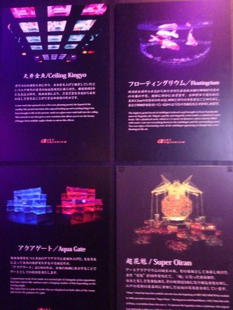 展示物のガイドを見ながらメイン会場に進む。「アクアリウム」とは───「アクア」すなわち「水生生物」に,「-アリウム」すなわち「…繋がっている物・場所・施設」のことを指すのだ。 水族館のような大型施設から個人宅に設置するような小規模のものにまたがる概念。 日本ではその中でも特に、観賞用に熱帯魚(観賞魚)や水草などを飼育・栽培すること、 またはそのために構築された水槽を含む環境を指すことが多いとのこと。「手鞠リウム」、「プリズリウムF1.8&F1.2」、「キリコリウム」、「カレイドリウム3D」等、名称に工夫の跡が。「大政奉還金魚大屏風」 大政奉還は日本の歴史においてさまざまな影響を与え、芸術の世界も大きな転換期を迎えた。 「大政奉還金魚大屏風」では、日本の美術史の移り変わりを表現した プロジェクションマッピングによる動く屏風絵を屏風型のアクアリウムに投射し、 その中を金魚が優雅に泳いでいた。 映像は、大政奉還の時期とその前後の時代というように、3つの時代のテーマで創り、 大政奉還がもたらした日本の芸術への影響が理解できる、幅約5.4mにもおよぶ 18連〈ビョウブリウム〉の大型作品。「ビョウブリウム」という屏風をモチーフにしたアクアリウムに、日本の美術史の移り変わりを表現したプロジェクションマッピングによる動く屏風絵を投射し、その中を金魚が優雅に泳ぐ。プロジェクションマッピングにより次から次へと色彩と模様が変わる。「大政奉還金魚大屏風」前に設置された「ラグーンリウム」に、屏風絵が映り込む演出。「ラグーンリウム」の中にも無数の赤い金魚が泳いでいた。映像は、大政奉還の時期とその前後の時代など、3つの時代のテーマで創り、大政奉還がもたらした日本の芸術への影響が理解できる。金魚大屏風には金魚の影も映り込んでいた。「大政奉還金魚大屏風」前の展示ヤード。「アースアクアリウム ジャポニズム」。地球をイメージした直径1.5mの球体の水槽の中を、錦鯉が乱舞する。アートアクアリウムは、金魚に加えて錦鯉がフィーチャーされているのが特徴。中国が発祥の金魚に対して、錦鯉は新潟県の山古志が発祥のメイドインジャパン。様々な色彩に変化。表面半分には水が流れ、この球体自体も回転しているのであった。刻々と変化する景色を球体の様々な角度から連写。新作「フローティングリウム」では、錦鯉のルーツ、新潟県長岡市山古志から取り寄せた最高級品種をじっくり堪能できたのであった。円筒型の水槽に、体長1mを超えているかのような巨大な錦鯉が優雅に泳いでいた。うわさではこの中に、最高級品種で1匹ン千万円するものもいるのだとか。この鯉の値段は?黒と赤の鯉も存在感充分。高額のニシキゴイは人間でいう『容姿端麗』と同じく『体形・色彩・模様』を基本に、『色調・資質』といわれる、バランスや仕上がりの良いもの、将来性の見極めと愛好者の感性などで価格に差が出て来ると。「プリズリウム F.18」透明な多面体でプリズム効果をもたらすアクアリウムは、18面体と12面体の2種類を展示。光のマジックにより、中に泳ぐ魚の群れが大きく見えたり、小さく見えたり、時には歪んで見える等、ユニークな見方が楽しめたのであった。「プリズリウム F.12」「アクアゲート」なんとなく縁日とか、金魚市の懐かしい雰囲気が。照明で様々な色に。キリコリウム。江戸時代から伝わる伝統工芸である、江戸切子の技法を用いた作品の中に珍しい金魚の姿が。上から。ビー玉も敷き詰められてて涼しげ。スイホウガン(水泡眼)。目の下に風船のように膨らんだ袋がついている中国産の品種で、中国ではよく飼われている金魚であると。上向きの眼球と眼の左右に付く風船のような水泡状の袋(眼球の角膜のみが膨大化したもの)があり、中にはリンパ液が満たされているのだと。こちらは赤出目金か?キャリコ水泡眼。キャリコ琉金に代表される、赤・白・黒・青(浅葱色)の入り混じった雑色柄を「キャリコ柄」というのだと。「テマリリウム」日本に古くからある遊具の一つである「手鞠」をモチーフとした、球体の作品。手鞠の特徴である色とりどりの可愛らしい模様を伝統工芸である伊賀組紐とマカを泳ぐ生きた金魚で表現。伝統工芸とアクアリウムが完全に融合した作品。近づいて。「超・花魁」『2016年アートアクアリウム誕生10年の集大成として誕生した、新たなる超大作と。アートアクアリウムの処女作でありながら10年に渡り主役の座に存在し続け、600万人に感動を与えたあの名作〈花魁>が想像を超えた規模になり遂に生まれ変わりました。その姿は生まれる前から伝説になることを約束された神の領域の美しさと、驚愕の大きさを兼ね備えた、まさしく世界最大の金魚鉢であり、作品名の前に“超”を与えられた特別な作品。この新・超大作である「超・花魁」は、3,000匹の金魚が舞泳ぎ、今までの「花魁」の1,000匹を大きく凌駕します。七色に光り輝くライティングと、神々しさ