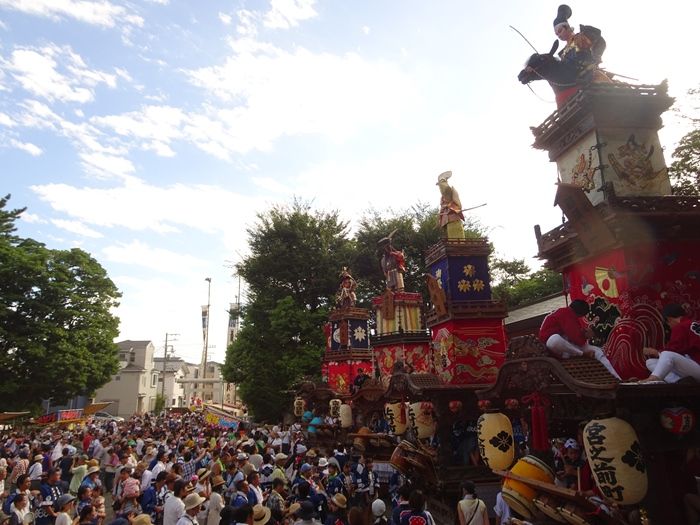 境内に並んだ山車の前には、それぞれの町内の方々等多くの見物客が。境内に並ぶ山車(右側5台)。境内に並ぶ山車(左側5台)。境内に並ぶ山車を順番に近くから。『一番 宮ノ前 那須与一』。『二番 上村町 源頼朝』。『三番 清水町 神武天皇』。『四番 宿庭(しゅくにわ)町 源義経』。『五番 刈田町 徳川家康』。『六番 大東町 楠木正成』。『七番 中東町 浦島太郎』。『八番 原町 日本武尊』。『九番 堀川町 仁徳天皇』。清水町の破風屋根上の囃子方の若い女性も楽しそうに。暑さに耐えて懸命に横笛を。中東町の山車の破風屋根上では男女のひょっとこ踊りを懸命に。外国女性らしき姿も。本部には進行放送役のレディオ湘南?のアナウンサーの女性。宮之前町の山車の前にはお囃子衆の長?である派手なご婦人?が衣装に着替えた子供と一緒に。宮之前町の山車の前にはお囃子衆の長?である派手なご婦人?がチンドン屋さんの姿で。恵比寿様も含めて6人で出番を待つ。そして三台の山車が手前に引き出されて3台によるお囃子の共演がスタート。まだまだお囃子の共演が続いていたが、切りが無いので引き揚げることに。振り返りながら、山車の姿を様々な角度から。年に一度の1日のみの祭り。猛暑の中、囃子方の懸命な姿が。ますます人の数は増えて。拝殿方面。山車の整列を振り返る。三ノ鳥居を挟んで9台の山車が。二ノ鳥居を潜り帰路に。出店の間を進み、車を駐めてある従兄弟の芸術館に向かったのであった。そして従兄弟の家で冷たいもの他いろいろとご馳走になり、我が父の兄弟姉妹で唯一元気な94歳?を迎えた叔母さんとも話をし、楽しいひとときを過ごした後家路についたのであった。 ・・・完・・・