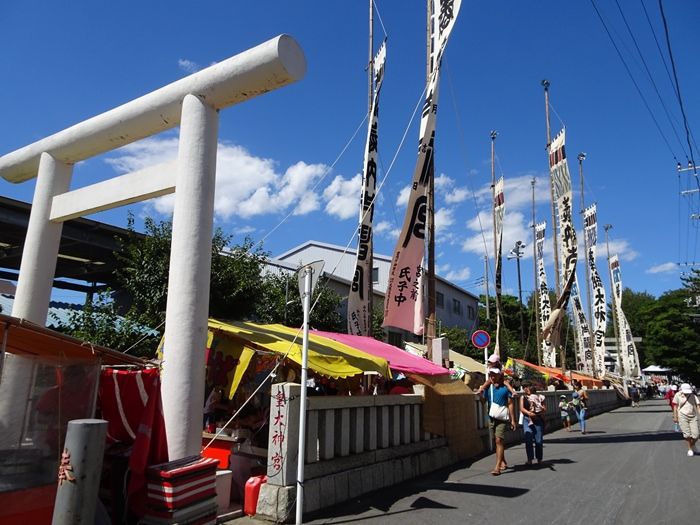 出番の時間まで待機している9台にの山車を見た後は、再び皇大神宮の一の鳥居まで戻る。一の鳥居から続く狭い参道には多くの幟が風に棚引いていた。山車の高さから山車は山車は鳥居を潜れないため、参道横にある道が山車の境内入口となる。参道の両側には屋台・出店が所狭しと並ぶ。懐かしき射的の店も。二の鳥居、三の鳥居が前方に。三の鳥居の前方に皇大神宮・拝殿が見えて来た。「相模國土甘(とかみ)郷総社 皇大神宮」 と刻まれた石碑。奈良時代の天平7年(735年)、相模国司が「相模国封戸租交易帳」を作成し、中央政府に報告した中に、ここ鵠沼付近を表す「土甘郷」が見られるとのこと。この「土甘」は「とかみ」あるいは「つちあま」とも「となみ」とも読む説があるのだと。「皇大神宮 由緒」ここ鵠沼の皇大神宮は、「お神明さま」とも「烏森のお宮」とも呼ばれている神社。832年(天長9年)の創建と伝えられ、延喜年間(901~923)に相模国土甘郷(とかみごう)の総社に列せられた。1104年(長治元年)には、鎌倉権五郎景政がその所領大庭荘を開拓し、伊勢神宮に寄進したことから「大庭御厨」と呼ばれるようになり、大庭御厨の総鎮守として尊崇を集めた。源平合戦の屋島の戦いで、平氏の掲げた扇の的を見事射抜いたという那須与一が弓と矢を奉納したとも伝えられている。「皇大神宮人形山車9基」説明板。「皇大神宮例大祭」の今年の?ポスター。例大祭の本部会場はテント造り。まずは手水舎でお浄め。社務所。藤沢市の無形民俗文化財に指定されている「湯立神楽」の神事奉納が行われる場所。湯立神楽は、日本の伝統的な神楽の形式のひとつ。釜で湯を煮えたぎらせ、その湯を用いて神事を執り行い、無病息災や五穀豊穣などを願ったり、その年の吉兆を占う神事の総称。別名を「湯神楽(ゆかぐら)」とも言う。皇大神宮 拝殿。祭神は天照皇大神(あまてらすすめおおみかみ)天児屋根命(あめのこやねのみこと)天手力男命(あめのたじからおのみこと)天太玉命 (あめのふとたまのみこと)天宇受売命(あめのうずめのみこと)石凝刀売命(いしこりどめのみこと)石楯尾大神(いしだておのおおかみ)八幡大神 (はちまんのおおかみ)春日大神 (かすがのおおかみ)創建は明らかでないが、天長9年(832)に社殿を建立した記録があり、それよりも更に古いとされています。平安時代末期に鎌倉・湘南を所領とした鎌倉平氏大庭氏の祖・鎌倉権五郎景正が、長治元年(1104)にこの地を伊勢神宮に御厨として寄進し保護を受け、大庭御厨総鎮守、現在の藤沢・西富・大鋸・鵠沼・辻堂などの相模国土甘郷(とかみごう)総社に列せられたそうです。境内配置図。 【https://ameblo.jp/shima0202/entry-12312551861.html】多くの境内社が左手に。石楯尾神社 (石楯尾神)。伊勢ノ宮(伊弉諾尊・伊弉冉尊)。稲荷神社(宇迦之御魂神)。豊受稲荷神社(宇迦之御魂神)。山王社(大山祇神)。恵比須の宮(八重事代主神・大國主神)。登由介神社(豐宇氣毘賣神)。神主さんが神事の準備中。「皇大神宮 人形山車 責任者」の襷を着けた長老。武者の姿も。そして15時から、いよいよ9台の山車の境内入場。『1番山車 宮之前町 那須与一』から順番に。既に2番山車以降も整列中。ここにも境内入場を指揮する責任者が。山車の引手、囃し手に水分補強に向かう?町内役員。そして『1番山車 宮之前町 那須与一』が境内広場に入場。破風屋根の上には獅子舞と囃子手が。凜々しい姿の那須与一像。今度は2頭の獅子舞が。そして赤の獅子はたまらず水分補強中。『2番山車 上村町 源頼朝』が境内入場。源頼朝像。『3番山車 清水町 神武天皇』が境内入場。神武天皇像。『4番山車 宿庭町 源義経』が境内入場。源義経像。『5番山車 苅田町 徳川家康』が境内入場。徳川家康像。手前から1番山車~5番山車が二の鳥居に向かって境内右側に整列。『6番山車 大東町 楠木正成』が境内入場。楠木正成像。『7番山車 中東町 浦島太郎』が境内入場。浦島太郎像。『8番山車 原町 日本武尊』が境内入場。『8番山車 原町 日本武尊』の破風屋根の上には毛むくじゃらの動物の姿が。顔は「八咫烏(やたがらす)」の如きであったが????。日本武尊像。最後に『9番山車 堀川町 仁徳天皇』が境内入場。仁徳天皇像。そして5番山車~9番山車が二の鳥居に向かって境内左側に整列。9台の山車が境内に勢揃いし、それぞれの山車のお囃子も賑やかに祭りもピークに。 ・・・つづく・・・・