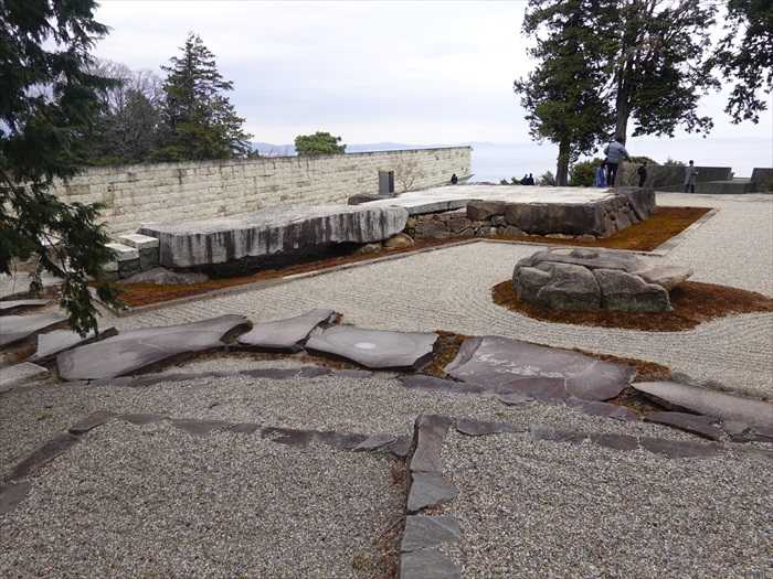 次に訪ねたのが「東大寺七重塔礎石 天平時代」。手前には石の歩道が。【東大寺創建の頃、金堂の両脇には東塔と西塔が聳えていた高さは100メートルを超えていたと思われる。しかし西塔は平安中期に落雷で消失。東塔も治承4年(1180)平重衡の南都焼き討ちにより消失した。その後俊乗房重源や栄西らによって再建されたが、康安2年(1362)落雷で消失。その後は再建されることはなかった。この礎石は藤田美術館創設者、藤田伝三郎の屋敷に据えられていたもので、東塔西塔どちらかは不明だが礎石としては我が国最大級のものである】。場所を変えて。白砂に描かれた模様・「砂紋(さもん)」・「箒目(ほうきめ)」も美しかった。水面の変化を表現する文様・渦紋(うずもん)が礎石の周囲に。上空からの写真(テレビ画像から)。上空からの写真(テレビ画像から)。そして、「明月門」に向かって石庭側から進む。「明月門」を内側から。門の前には、長方形の礎石が並んでいた。「百済寺 礎石」。【伝承によると、百済寺は聖徳太子建立の熊凝精舎(くまごりしようじゃ)を引き継いだ百済大寺の故地であるとされるが、古代より移転改称があり現在地が創建の地である確証はない。この石橋は現在の寺域より移された。】「藤原京 石橋」。【藤原京は日本初の唐風都城として、大化改新以降の首都として作られた。1990年代に発掘調査が進み東西の京極大路が発見され、規模が10里四方(約5.3km )で平城京や平安京よりも広い古代最大の都であったことが判明した。この石橋は域内にあった旧家の庭にあったもの。】石垣の前にあったこの巨石も「藤原京石橋」と共に運ばれたものであろうか?「名月門」の「門幕」の紋はOdawara Art FoundationのOとAを図案化したもの と。「石造五重塔 高麗-李朝初期(14世紀)」【明月門が建っていた青山の根津美術館旧正門から、通りを挟んで向かいの旧家の蔵の前にあったもので、再開発のためこの地に移された。】「大官大寺 瓦 白凰時代」【文武天皇(在位697-707)建立の官寺で藤原京の東南、香具山の麓に建てられた。大官とは「おほつかさ」とも読み天皇を意味する、官寺の中でも最高位の寺院であった。昭和40年代から発掘調査が行われ、金堂、講堂、九重塔などの跡が確認された。九重塔は初層一辺が15メートルで、法隆寺五重塔の初層一辺63メートルに比しても倍以上の大塔であったことがうかがわれる。この瓦は伽藍の一部を荘厳していたもので、失われてしまった大寺の面影を偲ばせる。】中央の瓦は溜まり水の中に、そして表面は苔に覆われていた。再び「夏至光遥拝100メートルギャラリー」横まで戻る。「井戸」であっただろうか?竹の井戸蓋で覆われていた。石段の下には開口が。「厠」と刻まれた石碑が近くにあったが・・・。「三角塚」の近くにあった、こちらは「石棺」の如くであったが。中を覗き込んで。「夏至光遥拝100メートルギャラリー」の南側の石畳を入って行った。「伽藍道」と。「京都五条大橋礎石 桃山時代(1573~1603)」。【村野藤吾設計で昭和16年(1941)に京都東山に竣工した「比燕荘」の玄関庭石として据えられていた。平成22年(2010)比燕荘の解体に伴い中林家より当財団に寄贈された。礎石は天正18年(1590)方広寺大仏殿の造営に当たって、豊臣秀吉の命によって五条大橋が石柱の橋に改修された時の礎石に当たる。石柱部は小川治兵衛設計による平安神宮中神苑の臥龍渡り石として使われている。】「法隆寺 若草伽藍礎石 飛鳥時代(592~710)」【日本書紀によると法隆寺は天智9年(670) 4月30日早暁に焼失されたと記されている。若草伽藍は明治期に発掘され、この礎石はその際に民間に流失したものと思われる。法隆寺創建時の貴重な遺品である】「元興寺礎石 天平時代(706~794)」【奈良の猿沢池近くの旧元興寺寺域から発掘された礎石4基のうちの3基と伝えられる。広大な敷地が塀で囲われていたものと思われ、いくつかあった四脚門、または食堂の礎石と思われる。礎石の上に建つ柱の直径は60センチでかなりの大型建築と推測される。】そして「光学硝子舞台」と「古代ローマ円形劇場写し観客席」。「光学硝子舞台」【隧道と平行に、冬至の軸線に沿って、檜の懸造り(かけづくり)の上に光学硝子が敷き詰められた舞台が設置された。懸造りは京都清水寺の舞台、鳥取の三徳山文殊堂などが知られる。冬至の朝、硝子の小口には陽光が差し込み輝くのが見える。観客席はイタリア、ラツィオ州のフェレント古代ローマ円形劇場遺跡を実測し再現した。この客席からは硝子の舞台が水面に浮い1いるように見える。】舞台背景は何も必要ないのであろう。相模湾、房総半島、水平線、そして空、陽光、雲と。「冬至光遥拝隧道」との共演の「光学硝子舞台」。「冬至光遥拝隧道」が「光学硝子舞台」への花道の如くに。その名の通りガラスでできた舞台。ガラスを支えるのは、ヒノキの木材で、清水寺などで用いられている懸造りという木の組み方で構成された伝統工法が美しかった。水