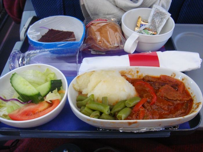 ポテトのすりつぶしたもの・ハッシュドポテト?に牛肉のトマト煮の様なものであった。