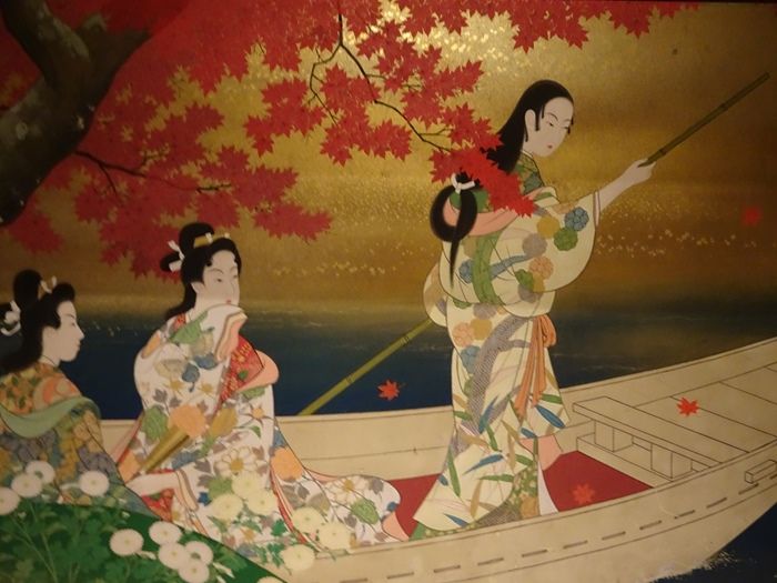 紅葉を船遊びで楽しむ姿。
