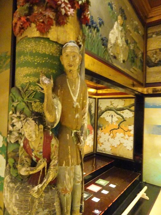 床柱は左右ともに巨大な檜で、精巧な彫刻 (中国の漁樵問答の一場面)が施されている。