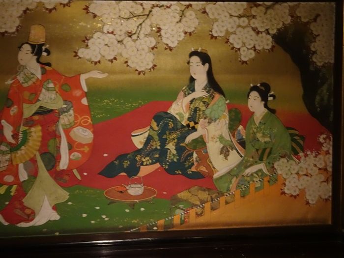 格天井には菊池華秋原図の四季草花図、欄間には尾竹竹坡原図の五節句が極彩色に