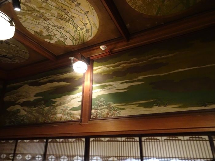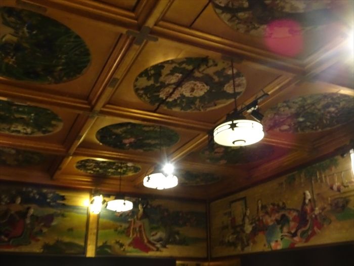 天井、欄間、障子の腰と、すべて磯部草丘の絵画で覆われ、壁面さえ見えない。