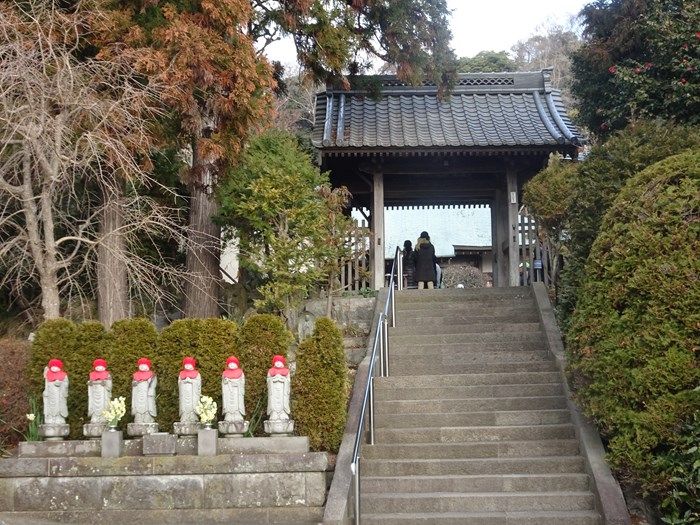 赤い帽子と涎掛けの六地蔵が迎えてくれた。