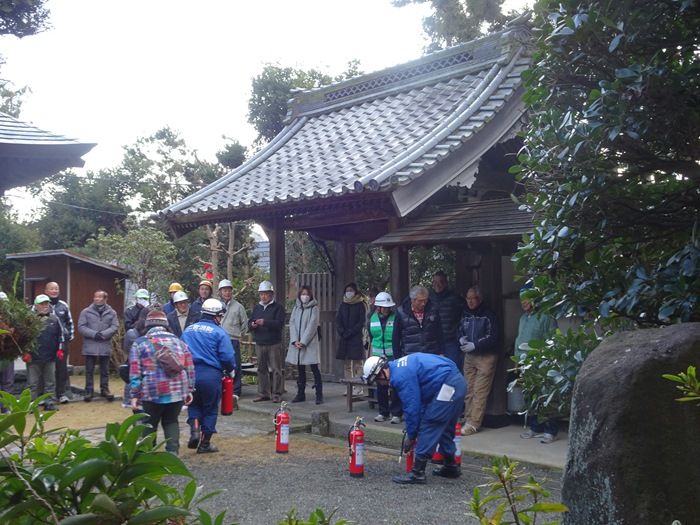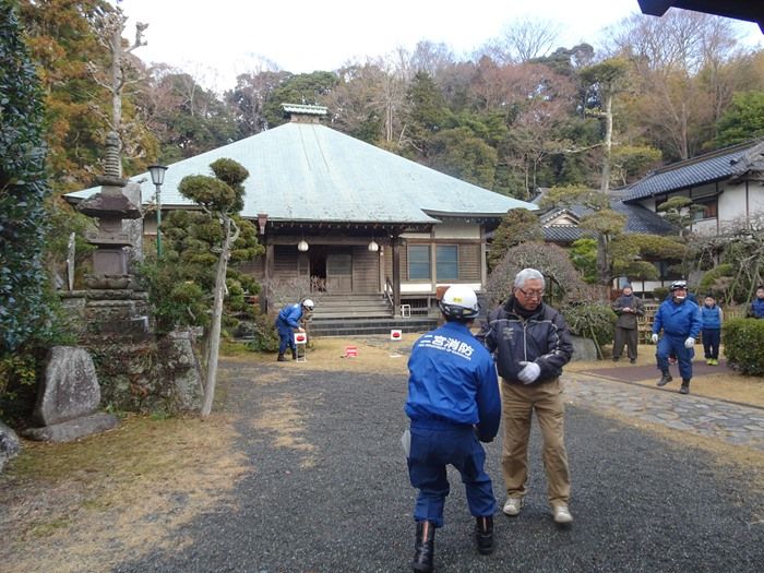 知足寺 本堂と二宮消防署員の方々の指導の下での訓練の様子。