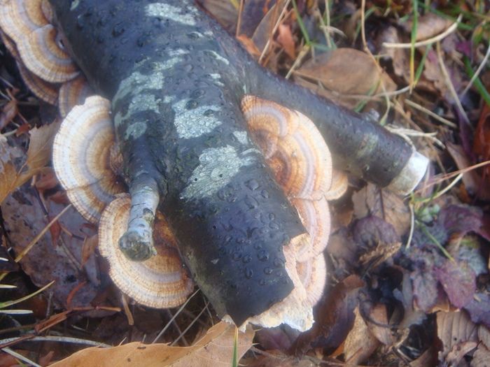 倒木の枝にはキノコが。